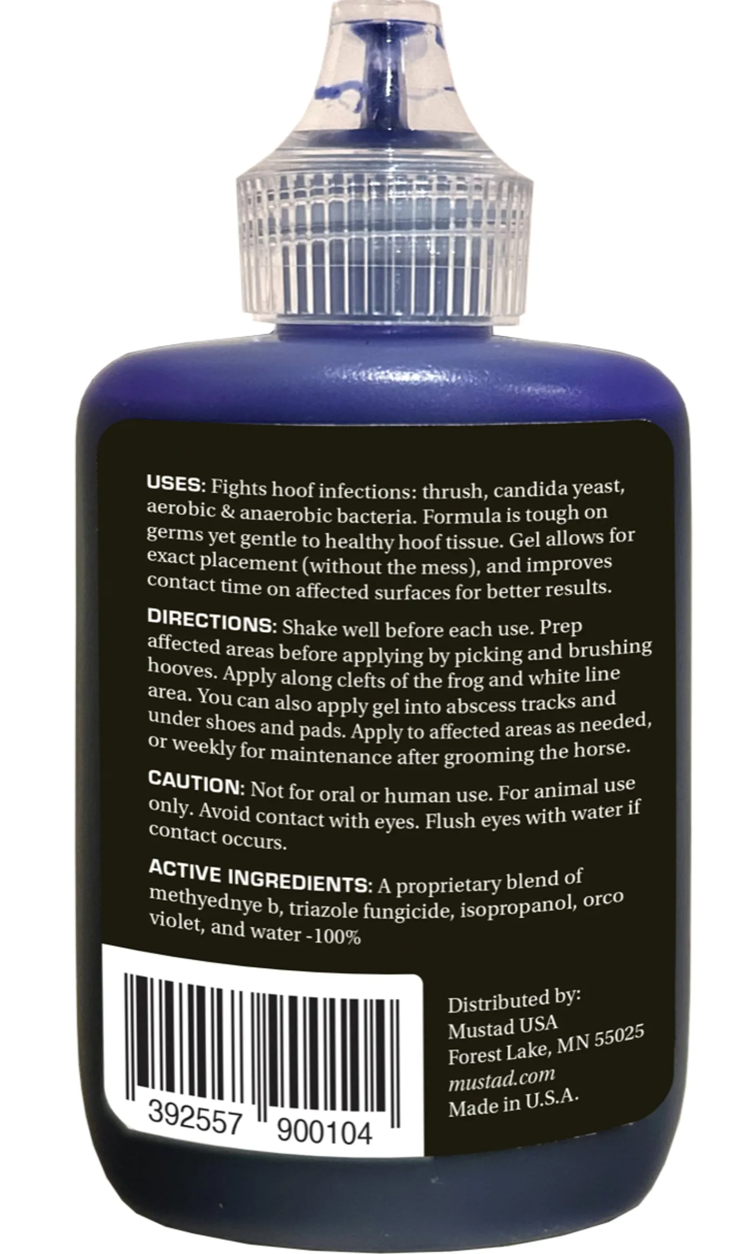 ComfortMix Thrush Treatment by Mustad is a new formula that will not harm sensitive tissue! This is a thin-gel formula designed to help treat thrush and white line disease in equines. With a pinpoint, no-clog nozzle, it offers exact placement of the product to affected areas of the hoof and a mess-free application.