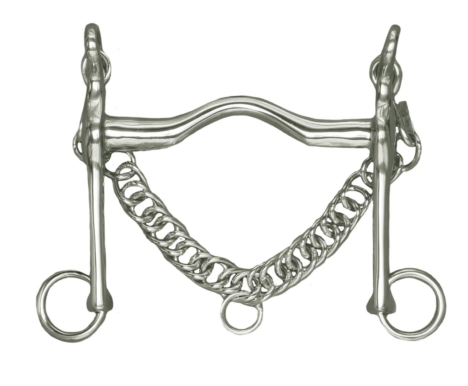 Made from copper enhanced German Silver to help stimulate salivation and encourage bit acceptance, the AlBaCon™ Wide Port Weymouth Bit has a high copper formula to help prevent dry mouth, yet retains the appearance and durability of German Silver. 17mm mouthpiece; 13cm shank. With curb chain.