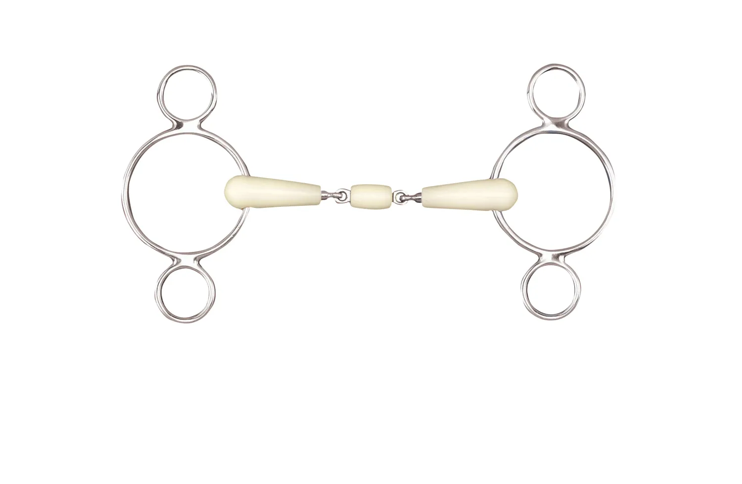 The Happy Mouth Bits® Double-Jointed 2-Ring Elevator bit features a mouthpiece covered in soft, flexible, yet extremely durable, apple-scented plastic. This mouthpiece material encourages bit acceptance and softness. Core and rings are stainless steel. Allows reins to be attached to cheeks or lower ring.