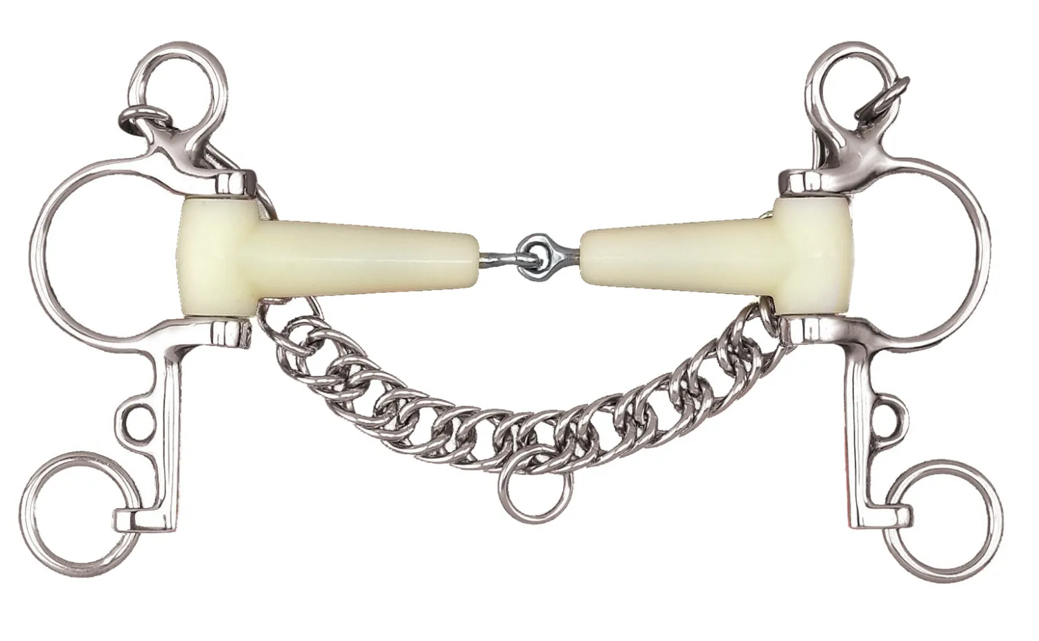 The Happy Mouth Bits® Jointed Pelham Bit has a mouth covered with a soft, flexible, yet extremely durable, apple-scented plastic which encourages acceptance and softness. Jointed mouth core is stainless steel. The bit design offers multiple functions, including the action of a snaffle, the action of a curb, and the ability to use a variety of rein attachments.