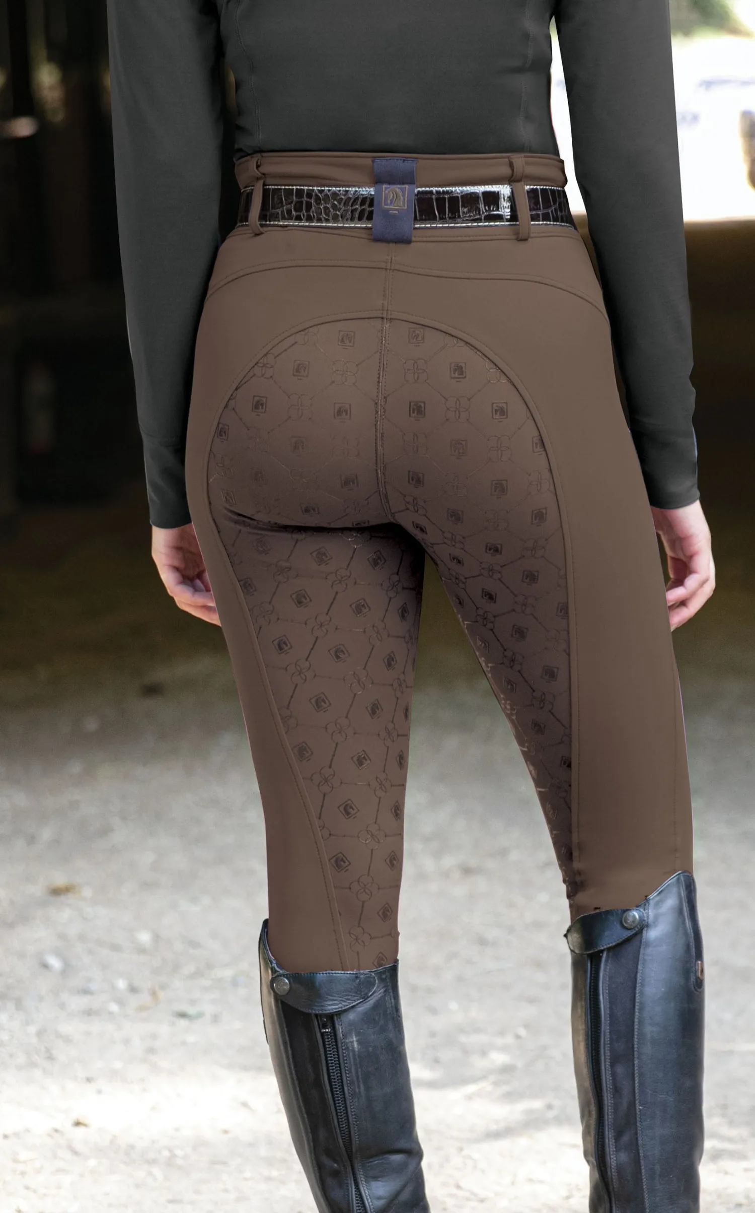 This ladies′ breech provides the high-waist fit desired by top-level riders. A silicone print on the seat provides a secure grip in the saddle without the added bulk of a full-seat layer.
