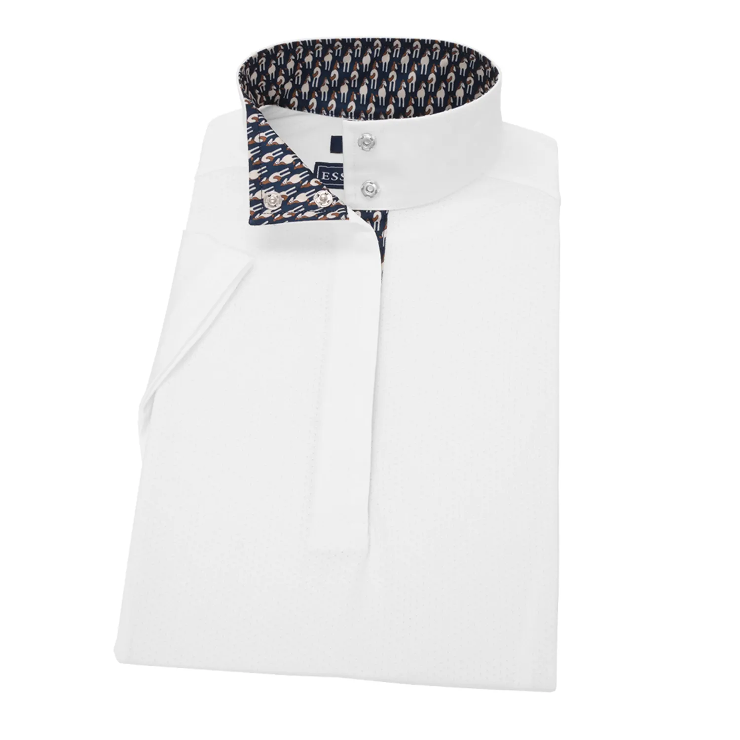 This Talent Yarn® Straight Collar Short Sleeve Show Shirt is made for those riders preferring a straight-up cut collar rather than an angled wrap collar. Like all Talent Yarn show shirts, it wicks moisture, provides antibacterial deodorizing and helps protect skin from the sun. Thermoregulating properties help keep the rider cool; Scotchgard® stain resistance makes it easy-care.