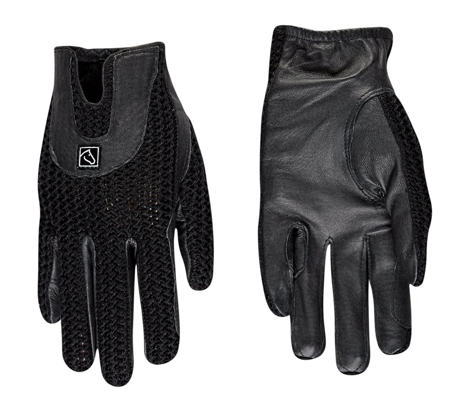 The SSG® Lycrochet Horseshoe Back Glove has a pigskin palm with reinforcements on the fingers in areas of rein contact. The cool crochet back makes it perfect for warm weather riding.