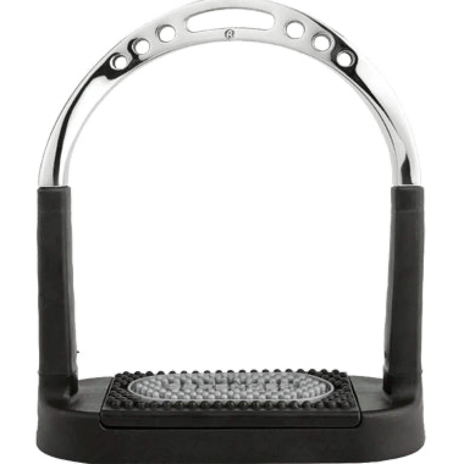 The contemporary design of the Flexcite Stirrup also helps support the release of your foot in the event of a fall. Polished stainless steel construction with black composite stirrup pad presents an elegant look. The wide tread has two types of rubber hardness for an optimal grip.