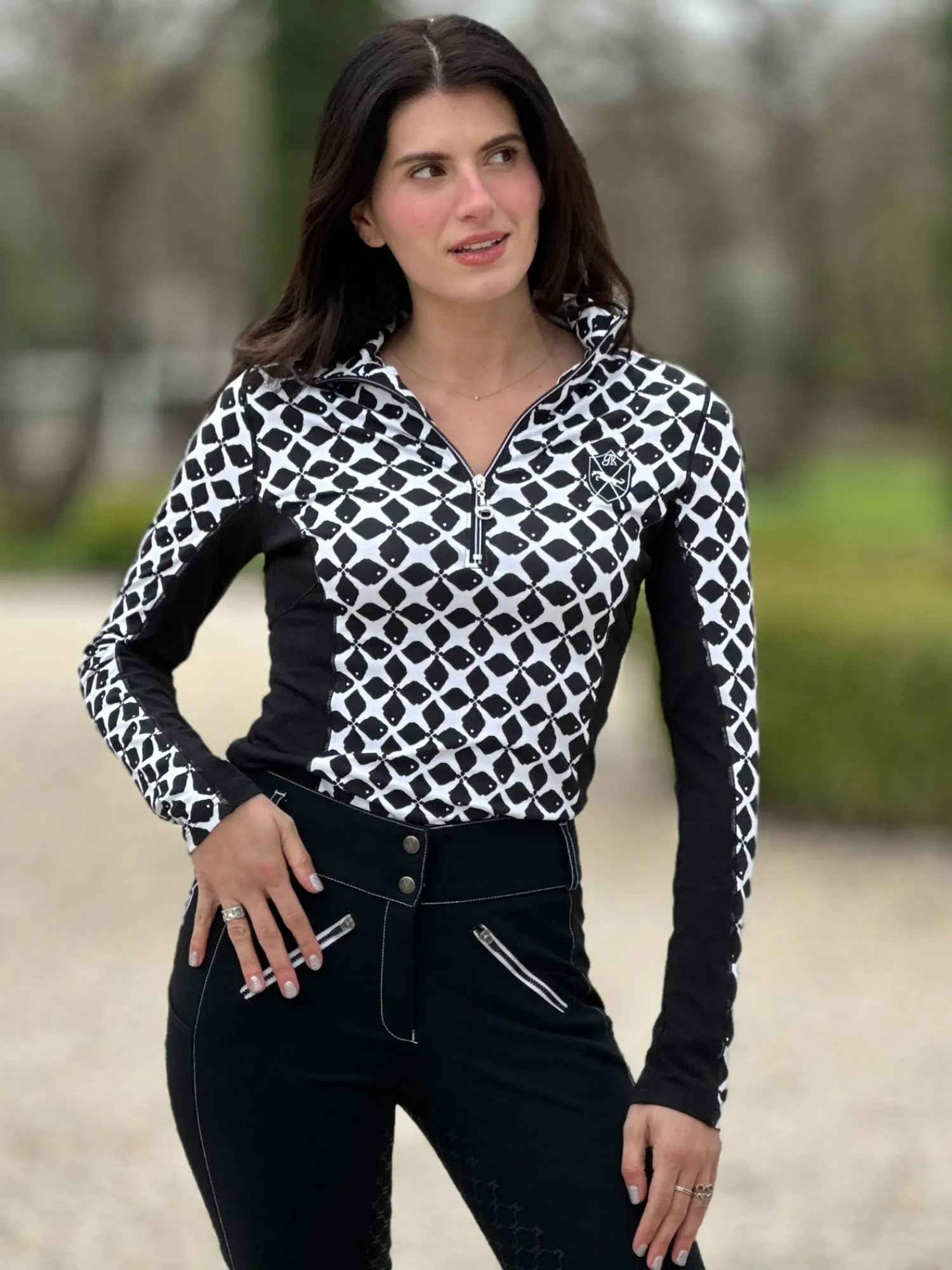 The Goode Rider@ Ideal Long-Sleeve Show Shirt is a classic–now in new prints and colors! Super soft Bamboo blend is moisture wicking and anti-bacterial. Mock neck zip front with stripe in zipper teeth. Logo patch on chest and contrast cover stitch throughout shirt. Vented mesh under armholes for extra breathability. Great for any sports activity.