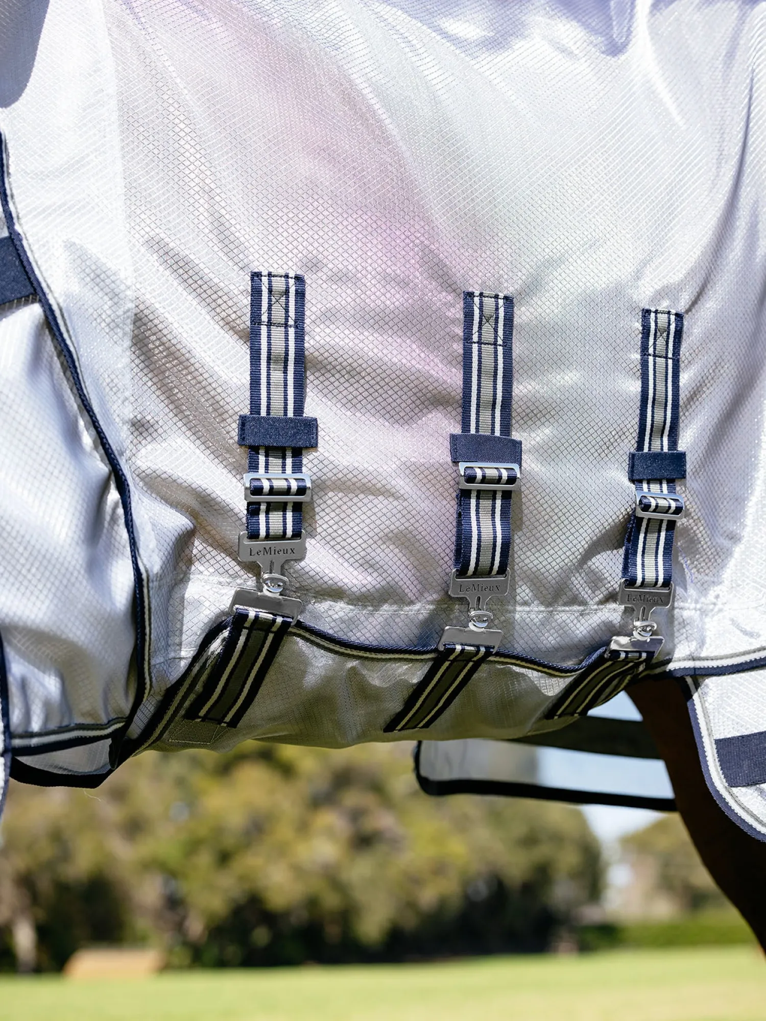 The LeMieux® Kudos AeroGuard Fly Sheet is 100% nylon mesh with silver anti-bacterial coating that provides a barrier against insects and midges as well as stands up to snagging. Fabric stands slightly away from the horses body around the spine and hips, promoting air flow and breathability. Shoulder gussets allow for maximum freedom of movement over the shoulder and ‘Wrap under’ stomach covering protects the belly. Adjustable stainless steel double trigger clip on the front chest allows for extra adjustability over the shoulders. Antibacterial and anti-static shoulder lining.