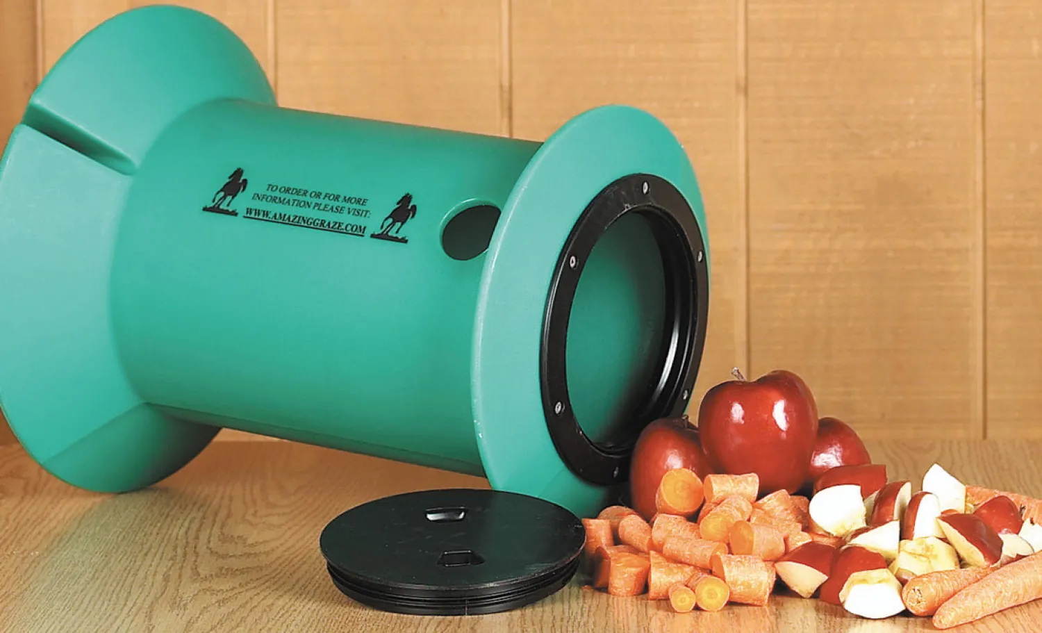 Fill the Amazing Graze with cut-up apples, carrots, hay cubes or other goodies and let your horse be rewarded by play! This treat-dispensing toy keeps your horse occupied in stall or paddock to reduce boredom that leads to mischief and vices. Made of durable polyethylene, it has a small opening that allows treats to spill out when your horse pushes it with his nose. It’s designed to roll in circles and to help maintain a natural grazing posture. The bottom twists off for easy filling and cleaning, then remains securely closed during play. Horses should not be left unsupervised with toy. 20″ long.