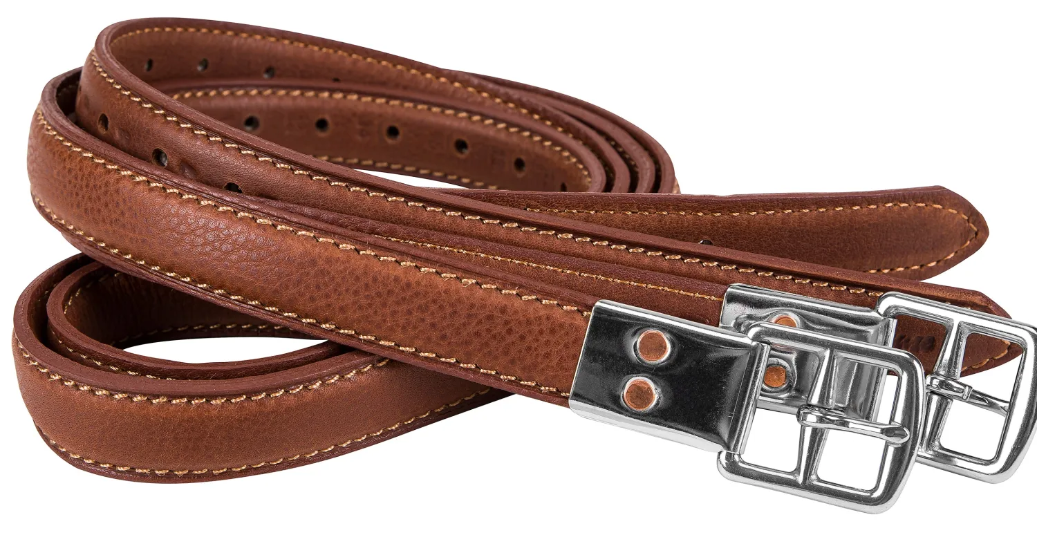 Marcel Toulouse European Style Double Leather Stirrup Leathers resist uneven stretching with minimum bulk. The design wraps a soft, thin layer of leather around nylon webbing. Stainless steel plates and buckles are riveted to one end. 1″ hole intervals. Pair.