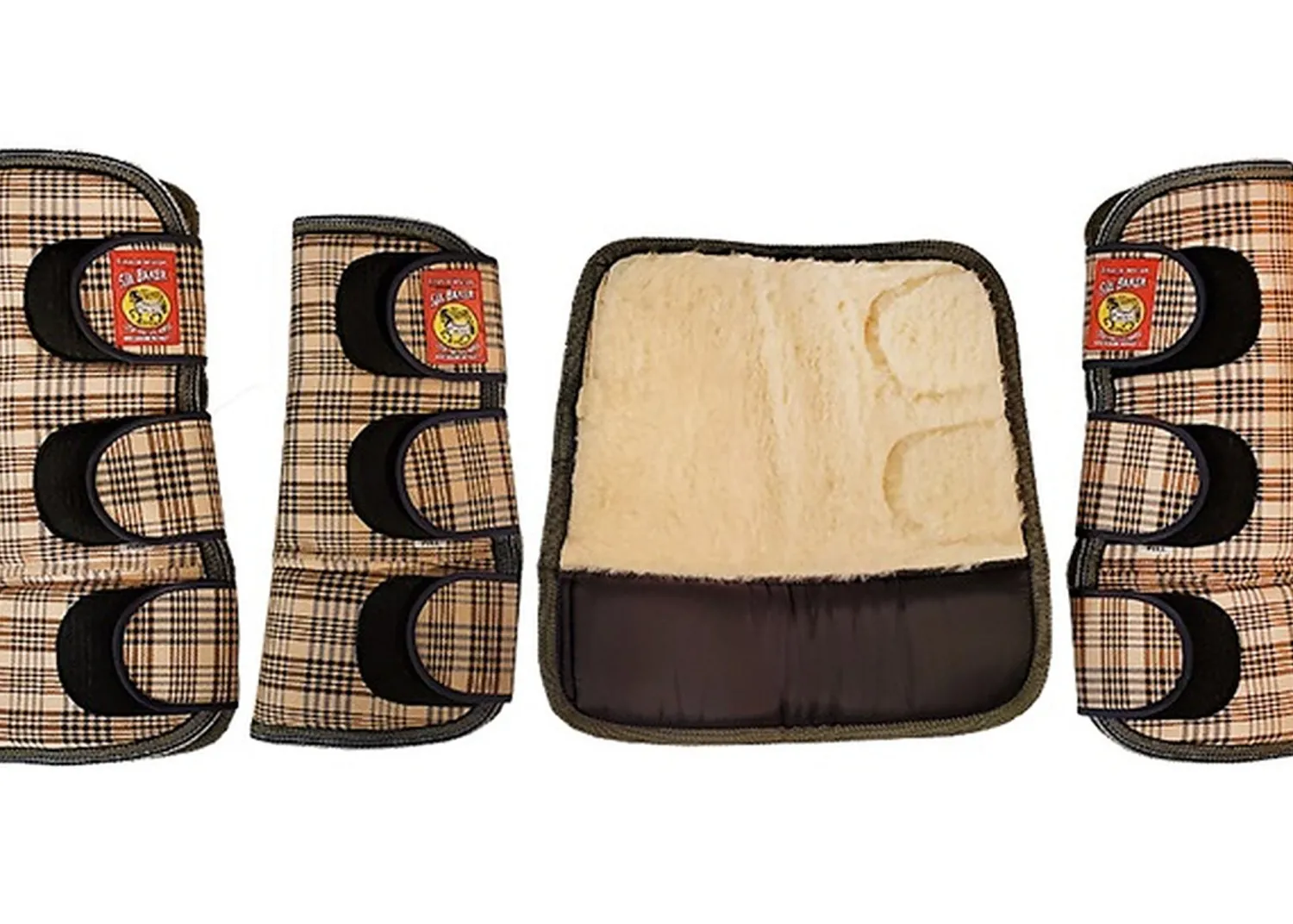 5/A Baker® Transport Boots, also called (Shorties) offer lower leg coverage from hoof to knee or hock when hauling. These rugged shipping boots feature a 1500 denier exterior in the beloved Baker Plaid, a dense 12mm foam middle layer to cushion and protect, upper portion lined in 400 gsm cream synthetic sheepskin fleece and lower portion lined in nylon.