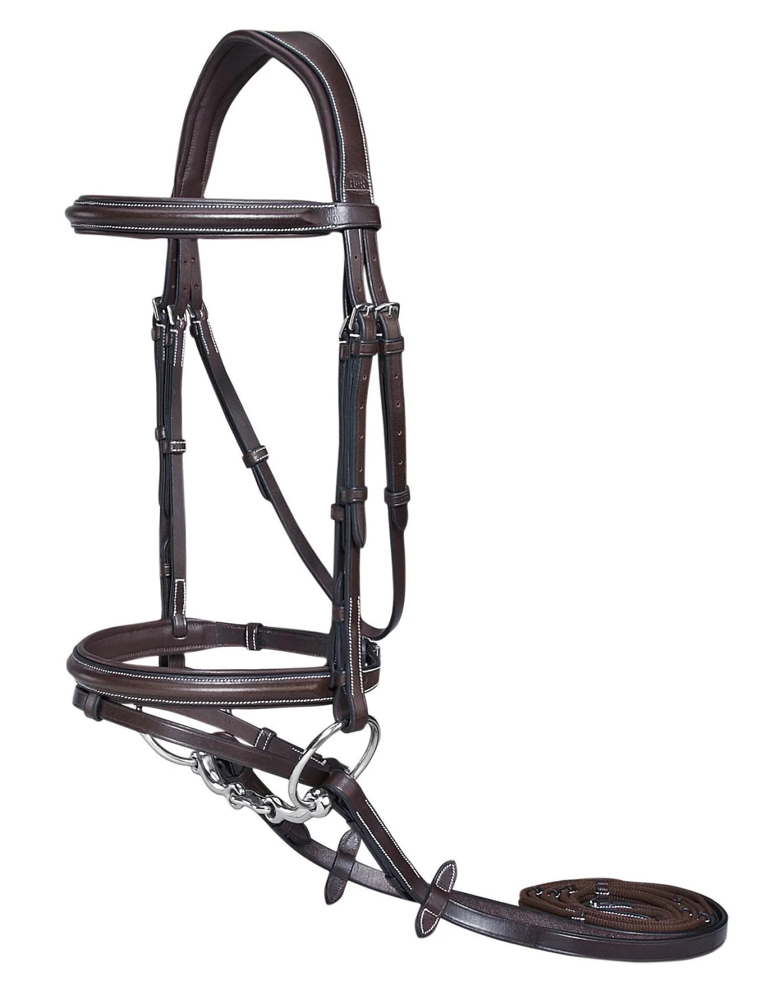 The Henri de Rivel Pro Plain Raised Bridle with Flash & Rubber Reins is a simple, quality leather bridle with a padded browband and noseband to provide horse comfort. The rubber reins included with the bridle offer a solid grip, thus helping to improve the connection between rider and horse. Skilled craftsmanship includes white stitching and durable stainless steel hardware. Reins are 3/4″ wide.