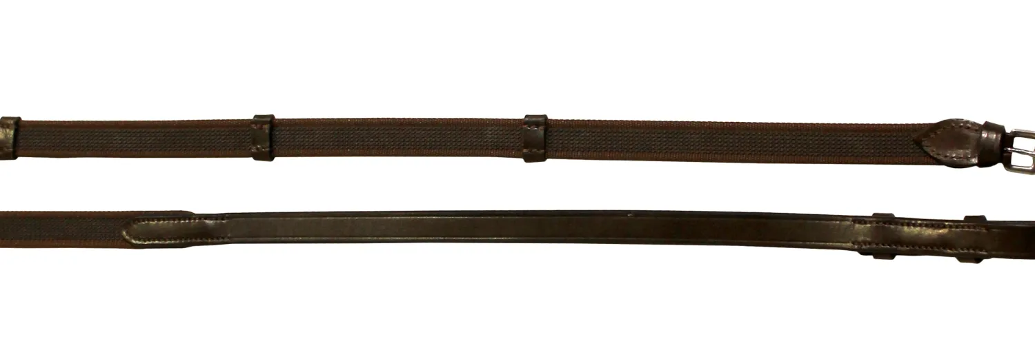 Suffolk™ Web Rubber Reins are correctly styled, nonslip reins. Rubber woven through the webbing and leather hand stops provide a secure grip. Hook stud ends. 3/4″ wide.
