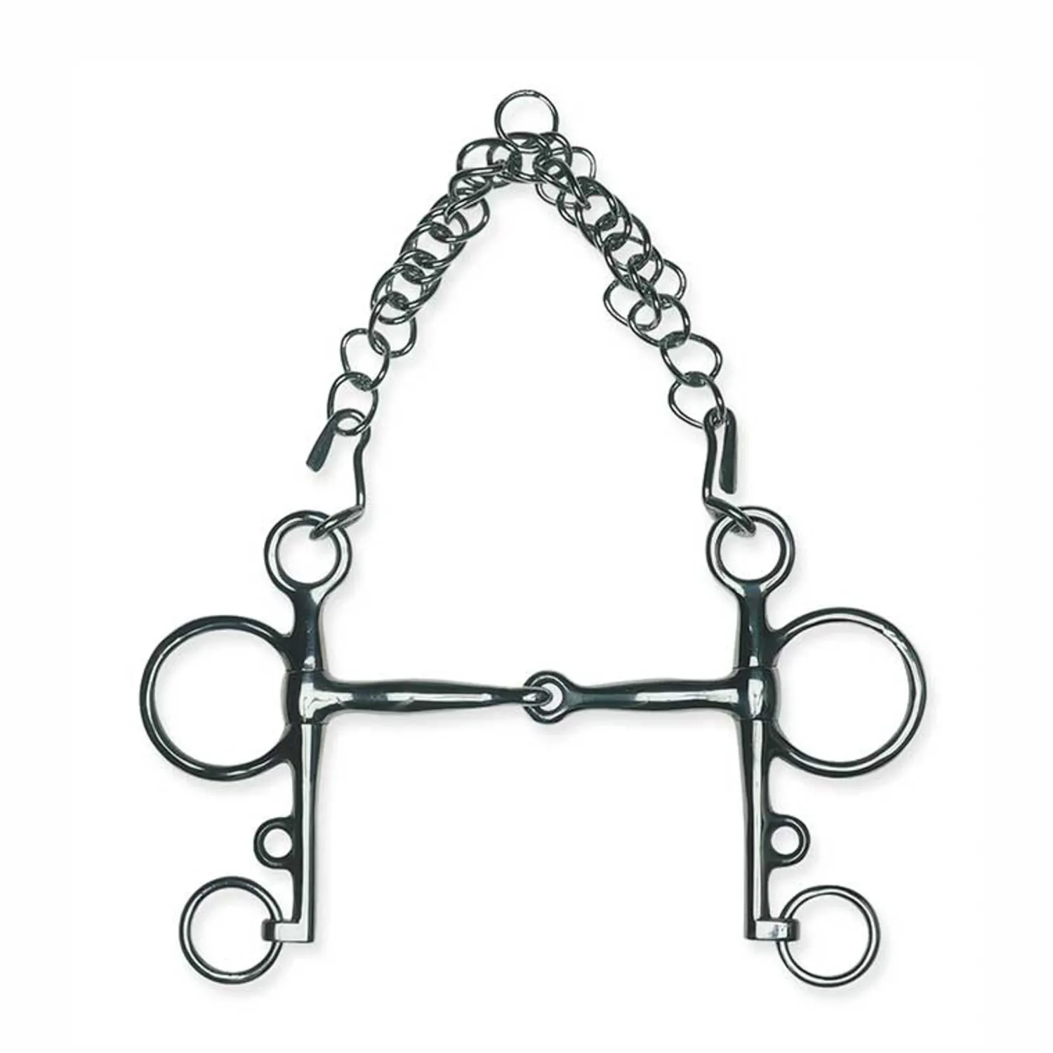This Metalab Solid Jointed Pelham is a Level 3 bit made of stainless steel. Solid mouthpiece is 13mm diameter. Cheeks are 5 1/2″. Curb chain and hooks included.