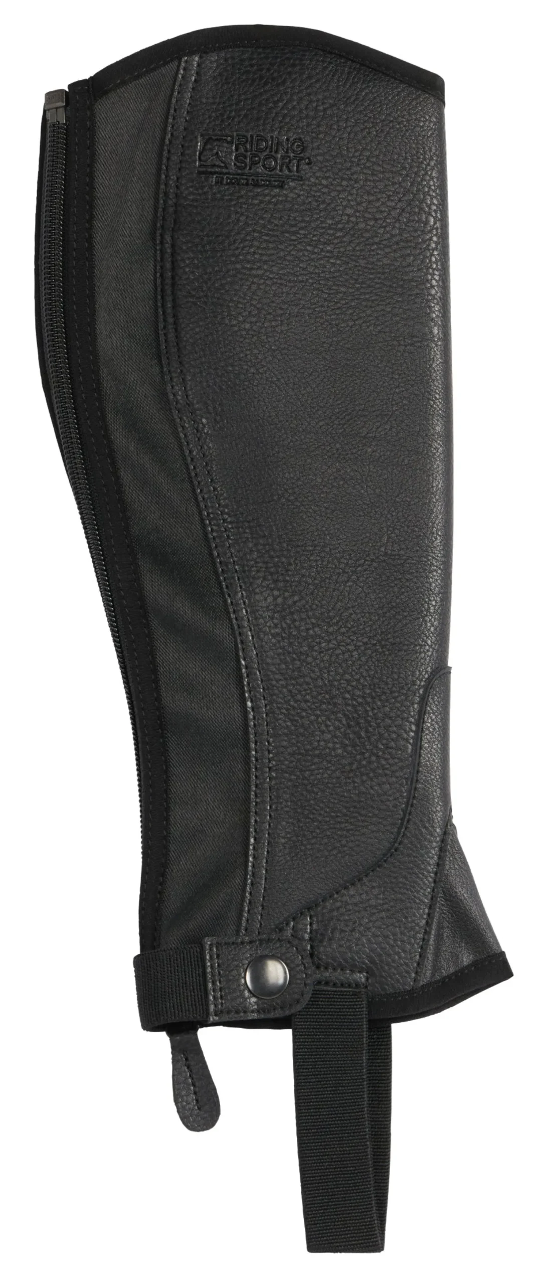 Constructed with a stretch back panel for a comfortable, easy fit, it has a rear zipper that closes from top to bottom. A zip keeper at the ankle keeps the half chap snug to your leg and secures the zipper pull. The under-boot strap is made to last from heavy-duty elastic.