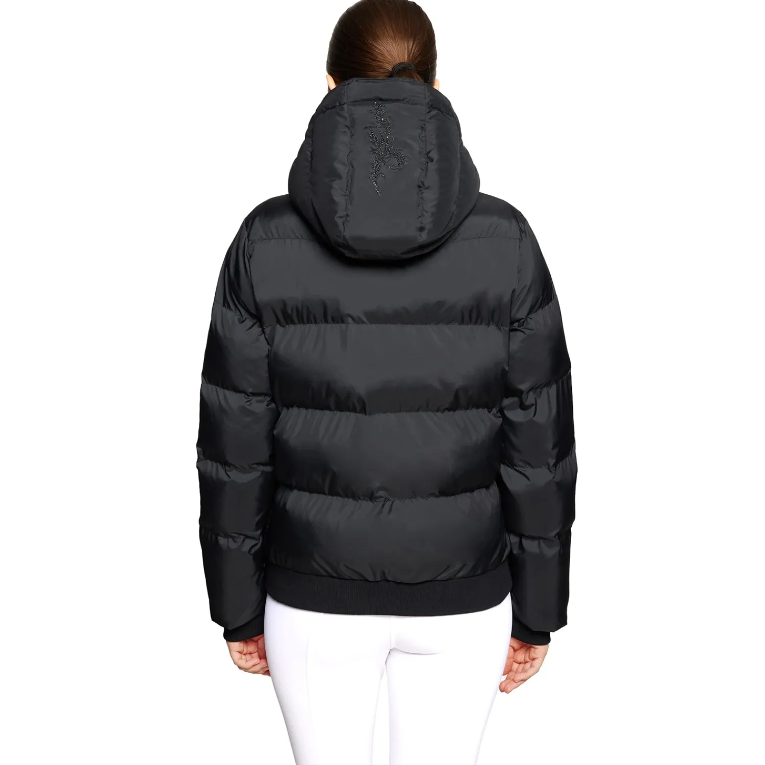Edgy and sophisticated, the Samshield® Billie Jacket is a puffer jacket with elegant bomber styling. Environmentally friendly insulation is comfortable, waterproof, warm and light. Soft-touch fabric repels water. Removable hood, full zip, double zipped pockets on the front and one pocket on the chest for all your essentials. Samshield blazon in Swarovski® Crystal Intarsia crystals on the front and elastic cuffs. Tone-on-tone Shamshield logo on the back.