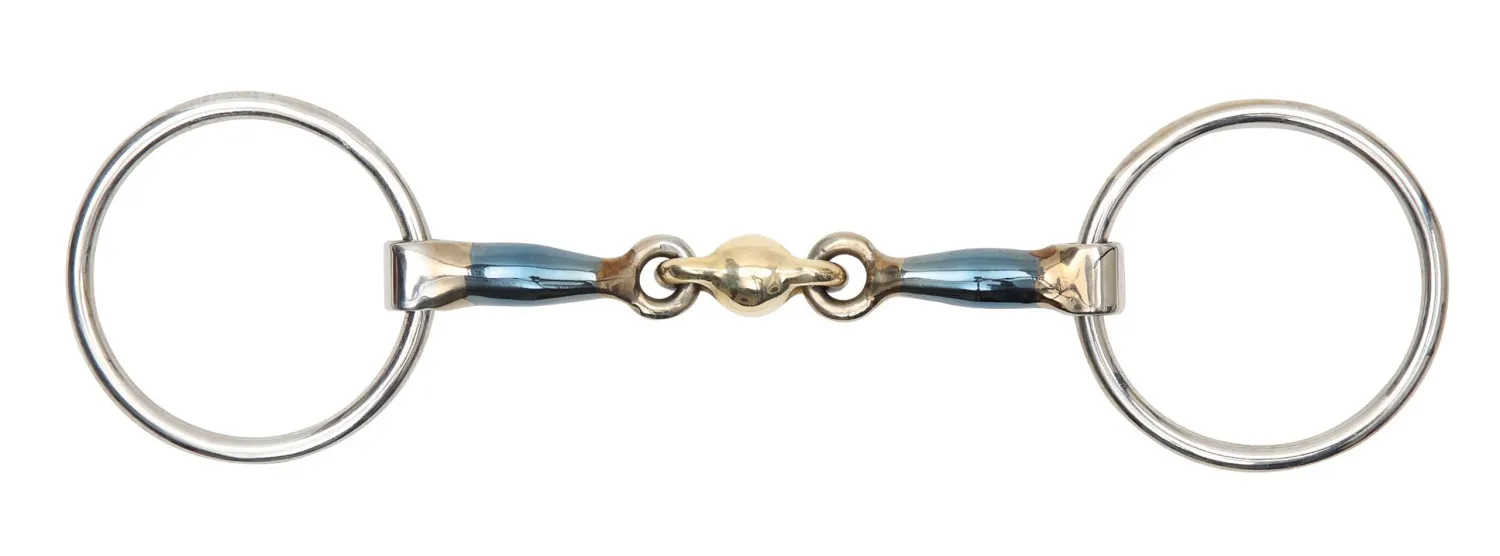 This Blue Alloy Loose Ring Bit with Lozenge has a design that can help discourage fixing and leaning. The loose rings offer much more movement than a fixed cheek provides to follow the angle of the tongue. The shaped brass alloy lozenge offers even pressure and encourages mouthing and contact, while eliminating the nutcracker effect of a single joint bit.
