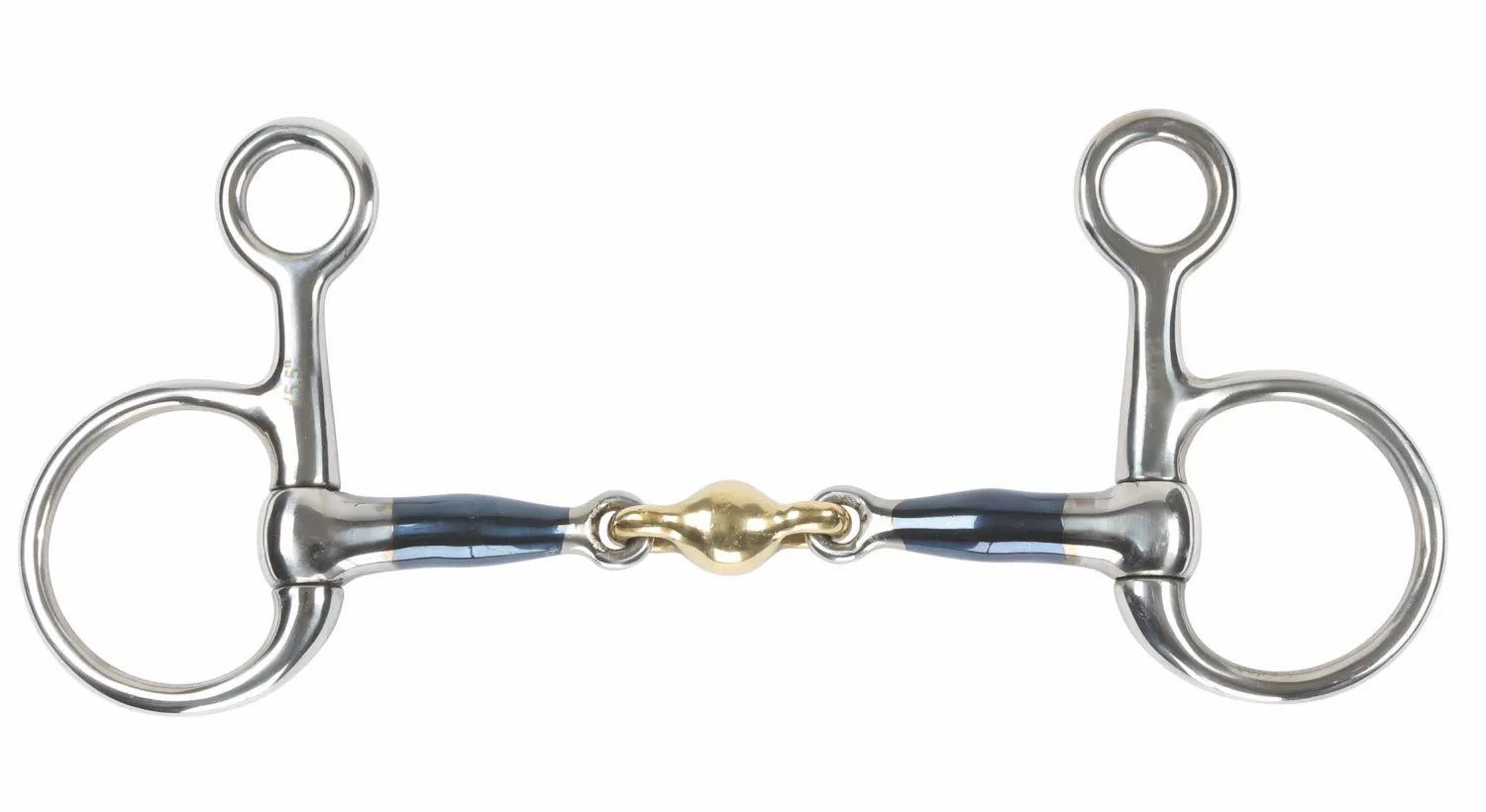 The Blue Sweet Iron Hanging Cheek Bit with Lozenge has a design meant to exert a little poll pressure to encourage flexion. The brass alloy double joint distributes pressure over both the tongue and bars of the mouth, encouraging acceptance and contact. 13mm mouthpiece; 110mm rings.