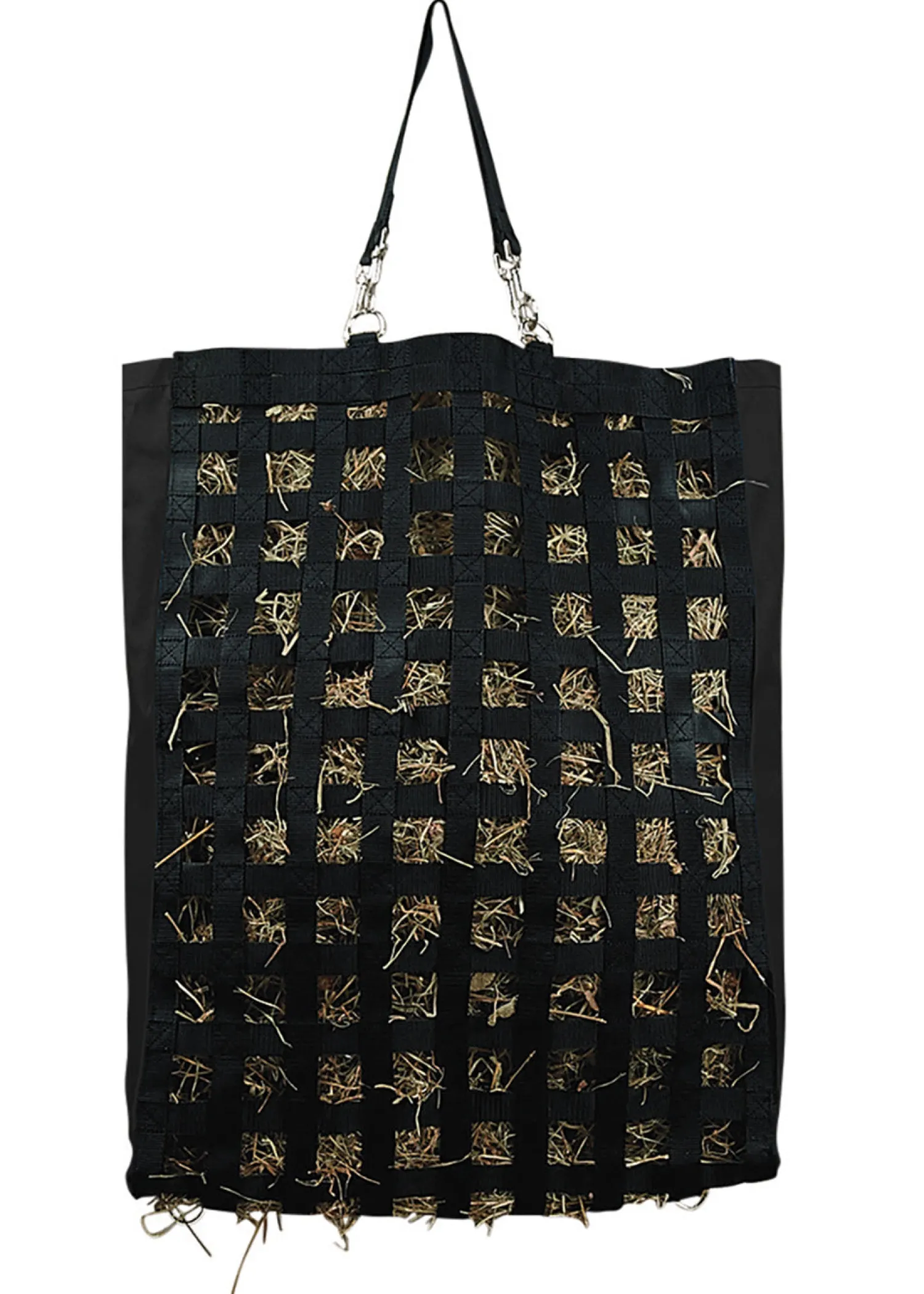 The Slow Feed Hay Feeder has small square holes that prevent the horse from eating hay too fast, which aids in good digestion. This hay bag also helps reduce mess and waste. It works well in trailers and includes a convenient hanging strap. 1 3/4″ x 1 3/4″ squares and a 6″ deep opening. 27″H x 21″W.