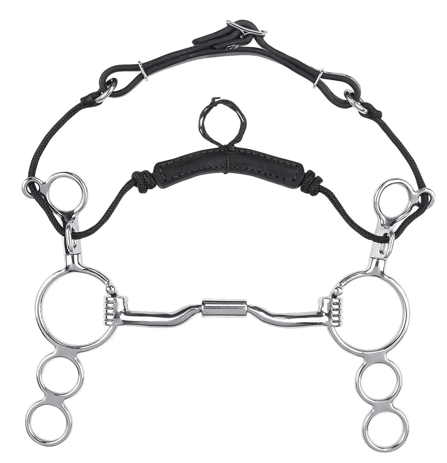 The 3-ring offers two rein positions; the rider chooses based on the feel each rein position offers. Stainless steel cheek piece with sweet iron mouthpiece that will discolor with use.