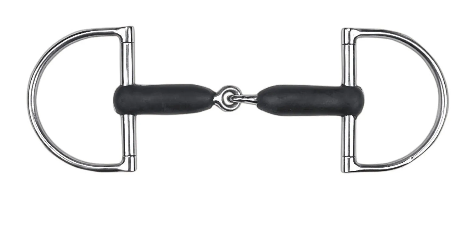 A mild snaffle, the Korsteel® Jointed Rubber Hunter D-Ring Bit combines a soft rubber-covered mouth with traditional dee rings. Single joint applies pressure to the palate. Stainless steel core and rings. 16mm mouth; 75mm rings.