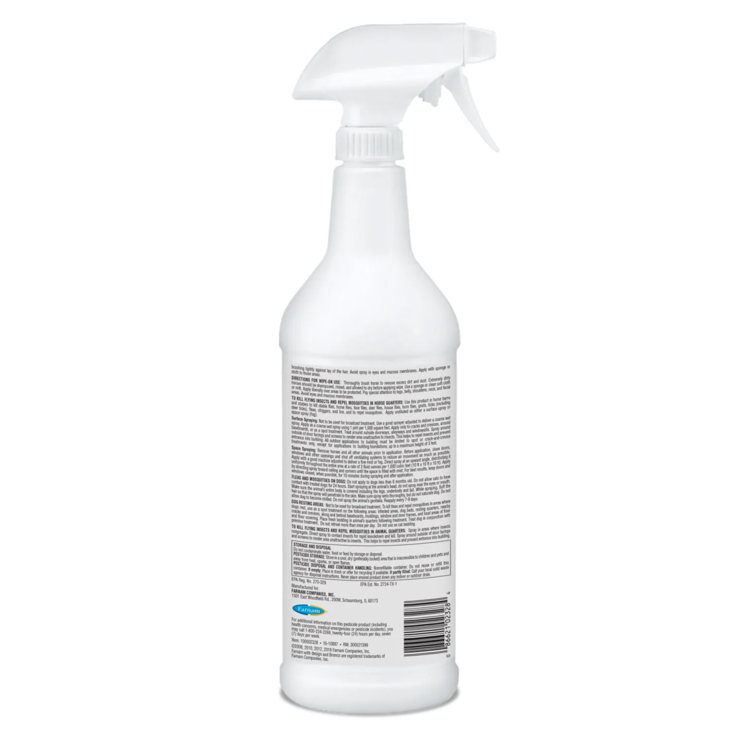 Farnam® Bronco® E Fly Spray, a water-based, ready-to-use fly control formula, is economical and effective. Bronco E repels and kills house flies, horn flies, stable flies, deer flies, horse flies and also mosquitoes, lice and gnats. It kills fleas and ticks on dogs. The citronella scent makes it pleasant to use. It contains a prallethrin-effective synthetic substitute for natural pyrethrin. Quart spray.