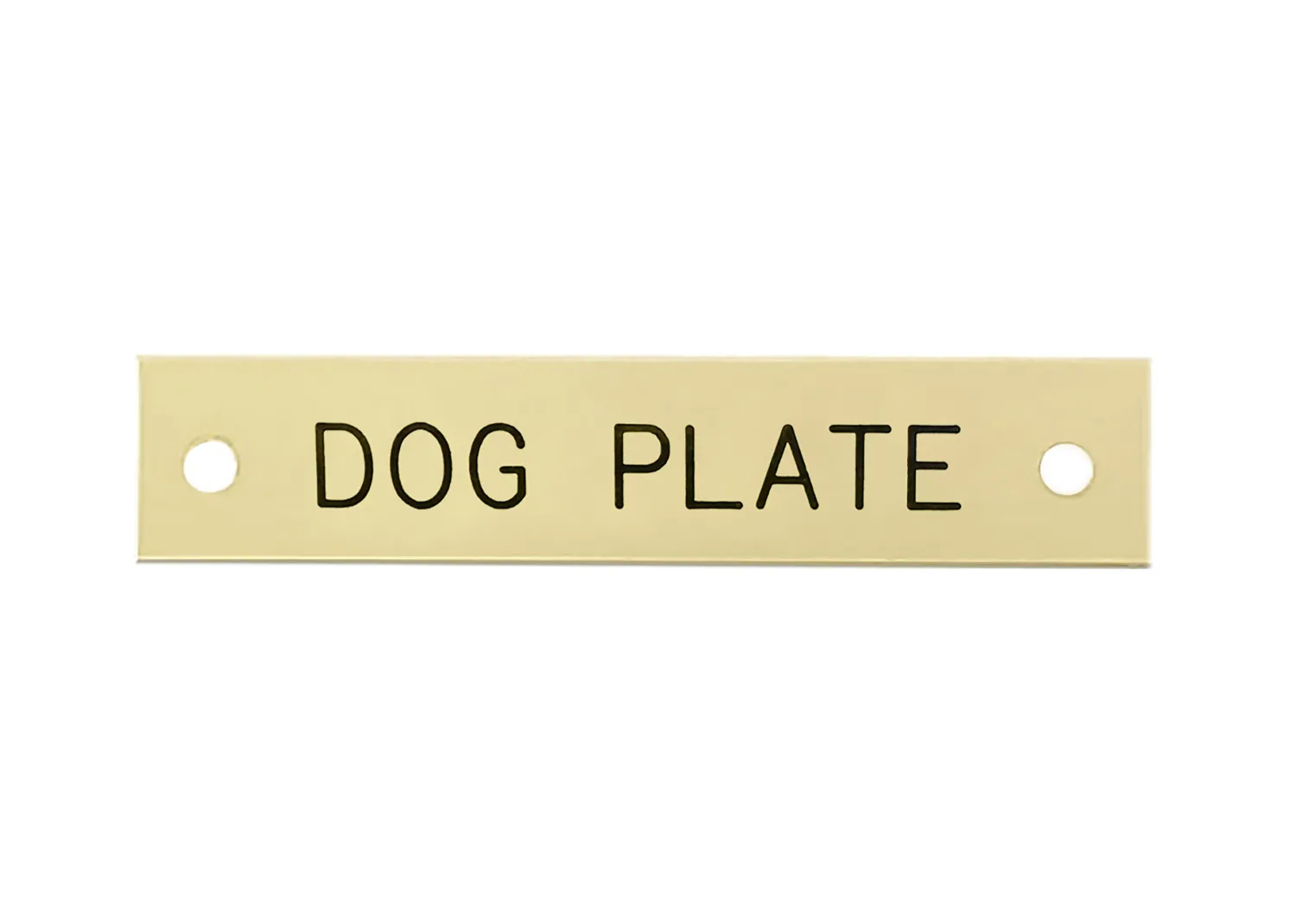 The Rectangular Dog Collar Plate in brass is a classic way to customize your dog′s collar or add contact information should your pup stray. Choose Block, Old English, Roman or Script letters, then enter up to two lines of text to be engraved. Predrilled 5/32″ holes fit rivets (included) for attaching the plate to a leather collar. Personalized items are not returnable.