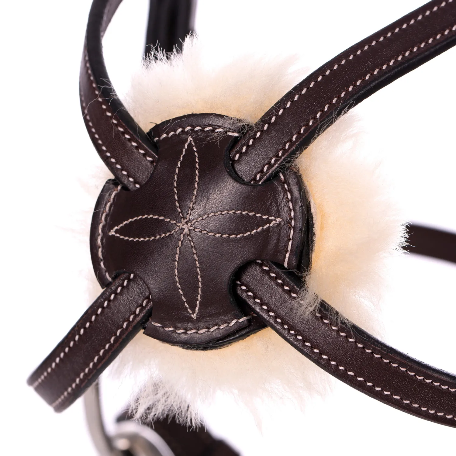 For further comfort, the ring style figure-8 nose has a sheepskin center disc. The browband is padded and fancy-stitched. Stainless steel hardware, including hook stud closures, add durability.