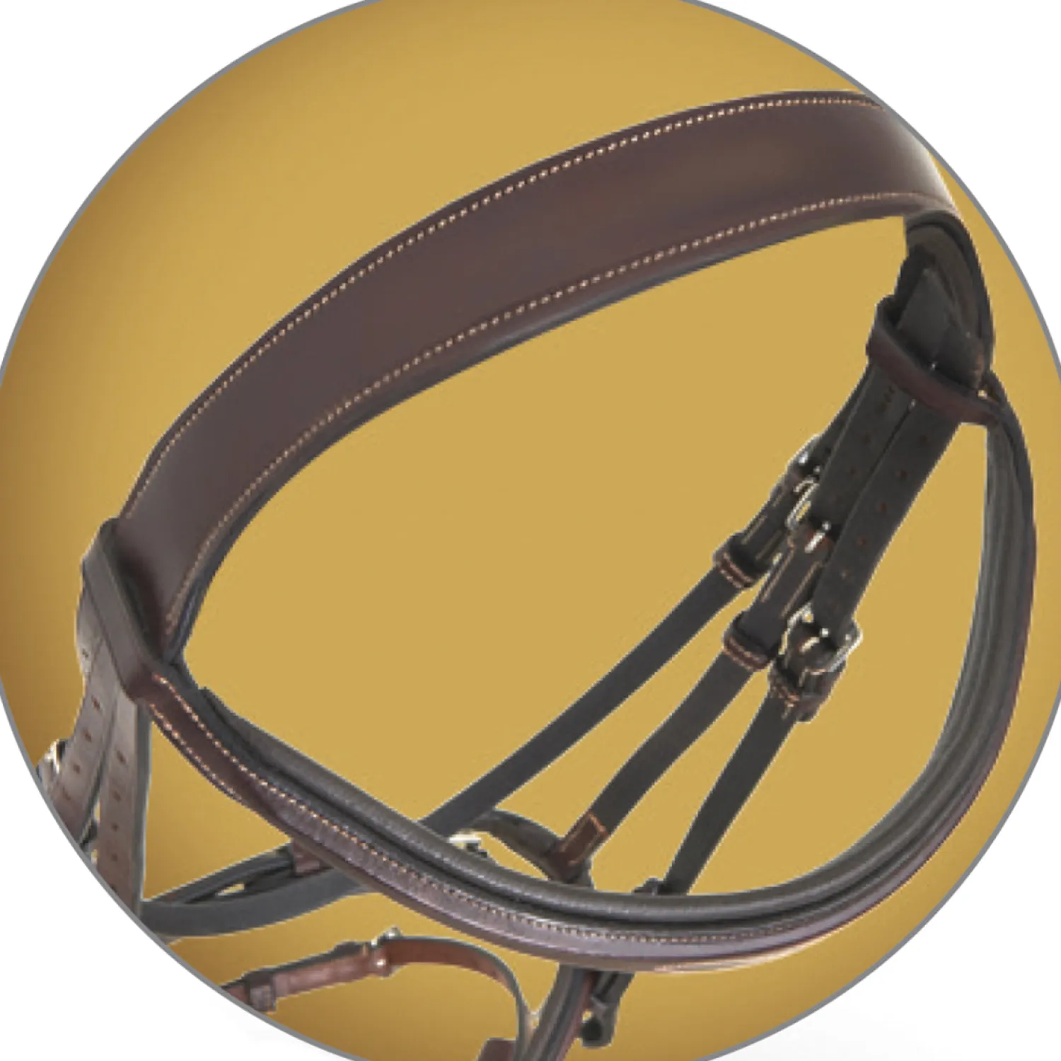 The Pessoa® Pro Fancy-Stitched Wide Nose Bridle is designed to take your ride up a level by blending elegant simplicity with the ultimate in horse comfort. This competition bridle features a padded contoured Comfort Crown™ in soft leather. The design reduces discomfort at the poll by distributing pressure over a wider area. The effect can create a greater connection between horse and rider.