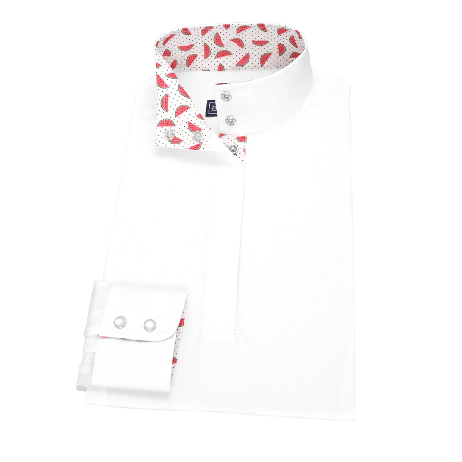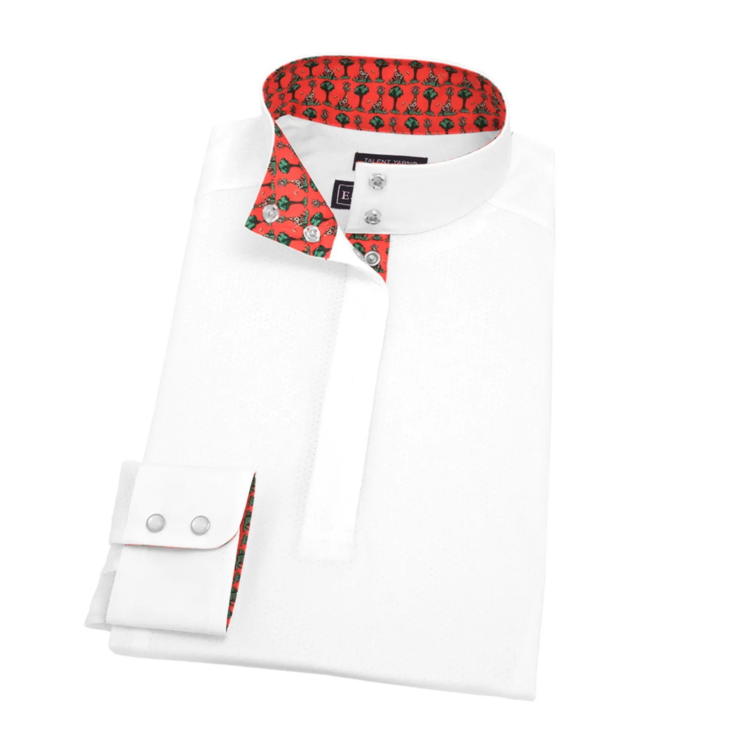 This Talent Yarn® Straight Collar Long Sleeve Show Shirt is made for those riders preferring a straight-up cut collar rather than an angled wrap collar. Like all Talent Yarn show shirts, it wicks moisture, provides antibacterial deodorizing and helps protect skin from the sun. Thermoregulating properties help keep the rider cool; Scotchgard® stain resistance makes it easy-care.
