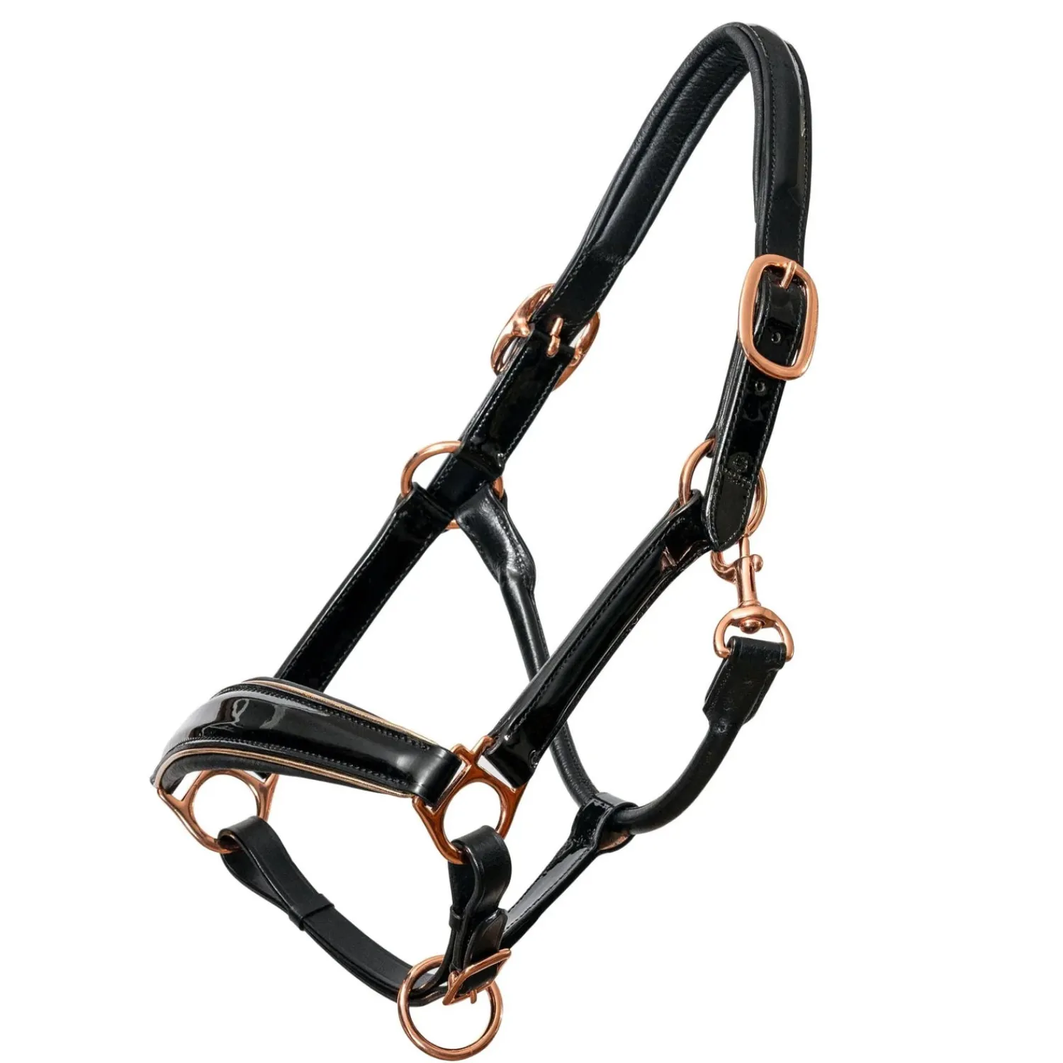 For a one of a kind, luxurious look, the Haler Ego Aurelia Rose Gold Halter will not dissapoint. The black patent leather conical noseband has ultra soft Nappa leather padding, rose gold buckles and fittings, and metallic rose gold piping set this halter apart. This halter matches perfectly with the Aurelia bridle creating a gorgeous matchy matchy set!