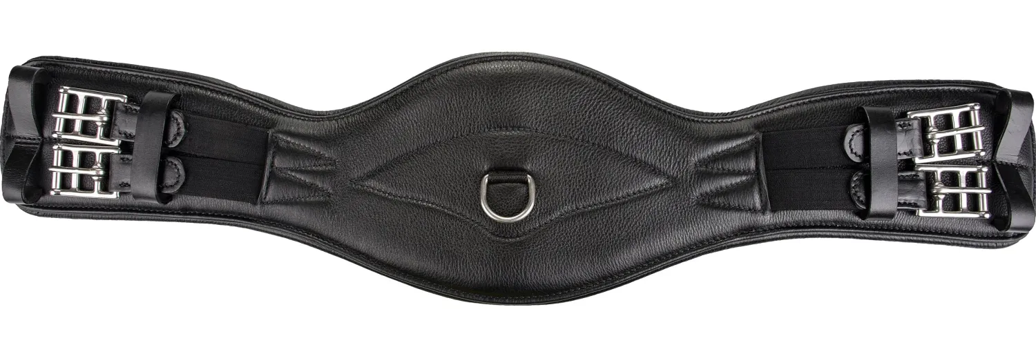 The Flex Rider® Curved Leather Dressage Girth has an anatomic shape designed for your horse’s comfort. Super-soft leather with comfortable foam padding makes this an excellent girth for training and shows. D-Ring in center allows attachment of training aids. Elastic ends with stainless steel roller buckles make adjusting easy. Black.