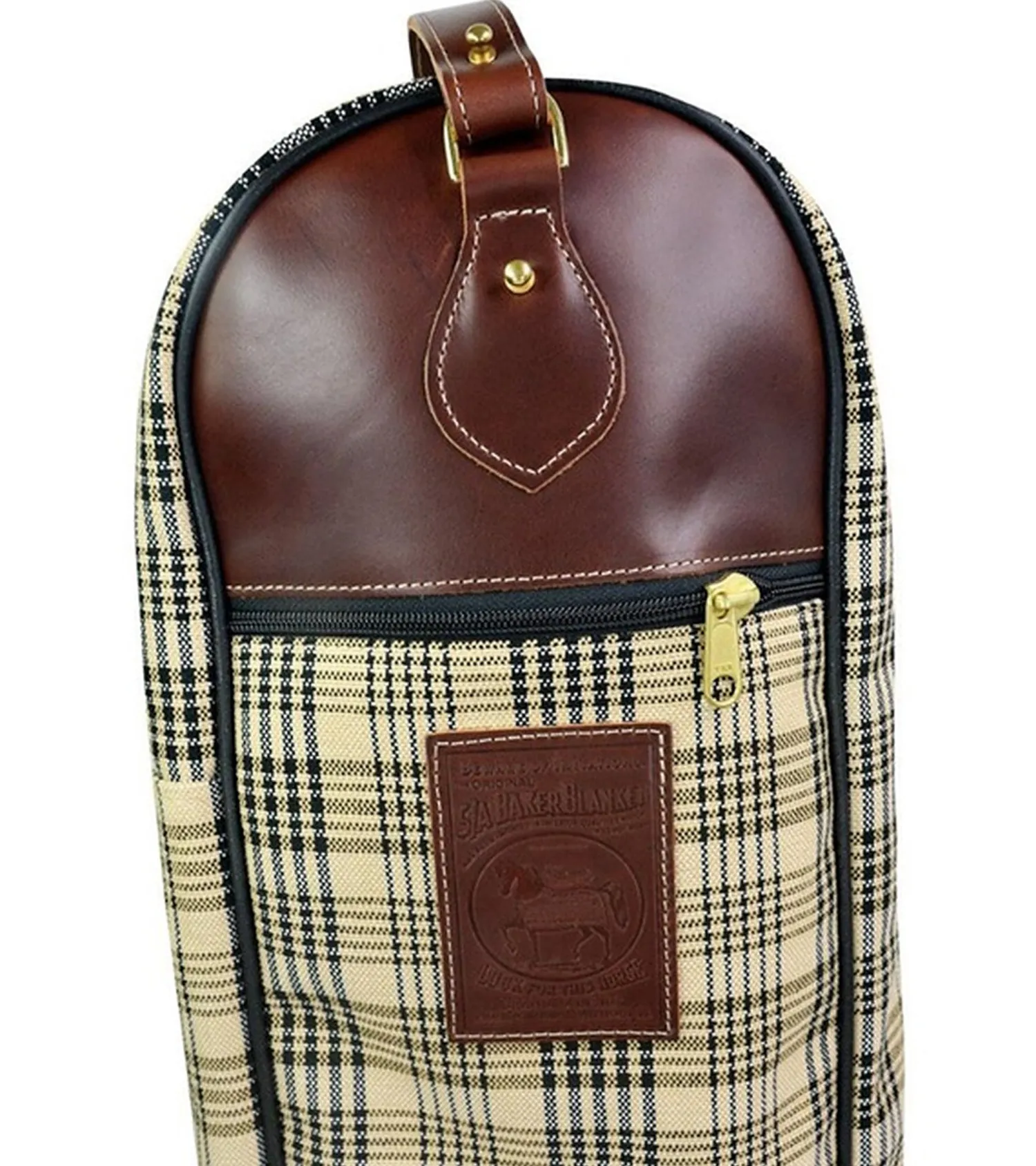 The 5/A Baker® Riding Boot Bag is made with Original Baker Plaid and trimmed with fine-quality leather. It is fully lined and beautifully finished, with just enough body to make it easy to load your boots. Zip pocket on front for accessories. Full zipper for access to interior.