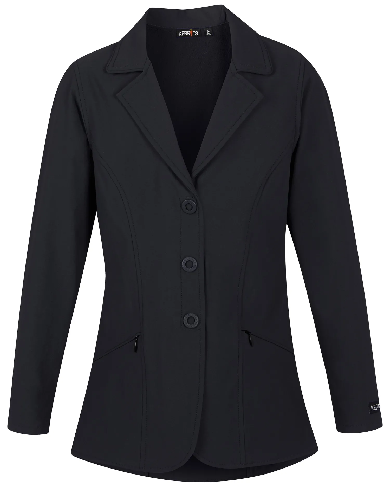 The Kerrits Kids’ Competitors Koat is thoughtfully designed as an affordable and versatile alternative to a traditional hunt coat. Based on the popular adult version but scaled down for children, this easy-care show coat features Kerrits’ washable, wrinkle-resistant Dynamic Extreme™ fabric. It offers the ultimate in four-way stretch for complete freedom of movement and an athletic cut that enhances the rider’s form. The classic three-button front has a hidden zippered placket for a smooth look with no gapping. The double-vented back completes the show-ring ready look.
