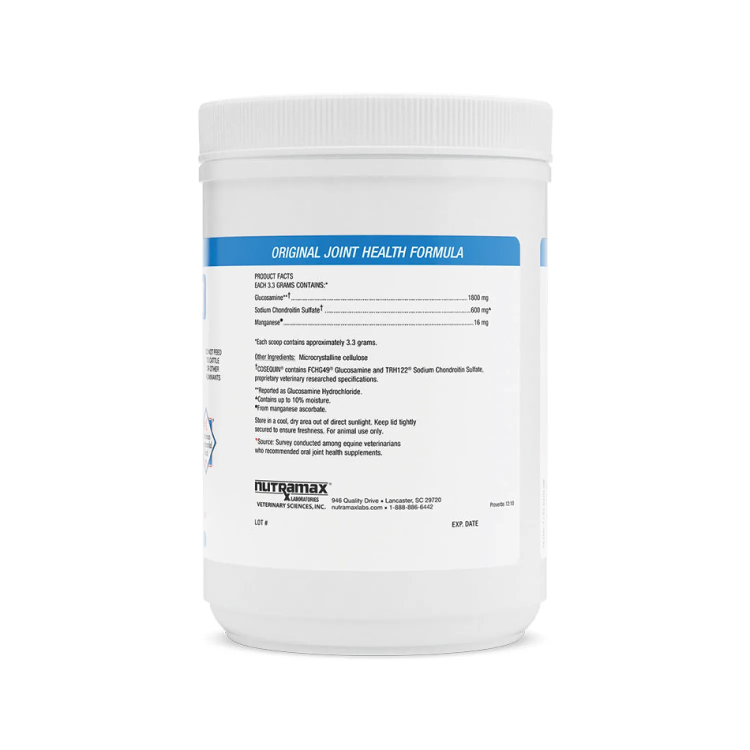 Loading and maintenance dosages are based on the horse or pony’s weight and are administered by a 3.3 gram scoop (included). Equines under 600 pounds receive a maintenance dose of 1 scoop per day; 600-1200 pounds receive 1-2 scoops per day; over 1200 pound receive 2 scoops. Each dose contains: 16 mg manganese, 1800 mg glucosamine hydrochloride, 600 mg sodium chondroitin. No vitamin C. 700 gm powder.