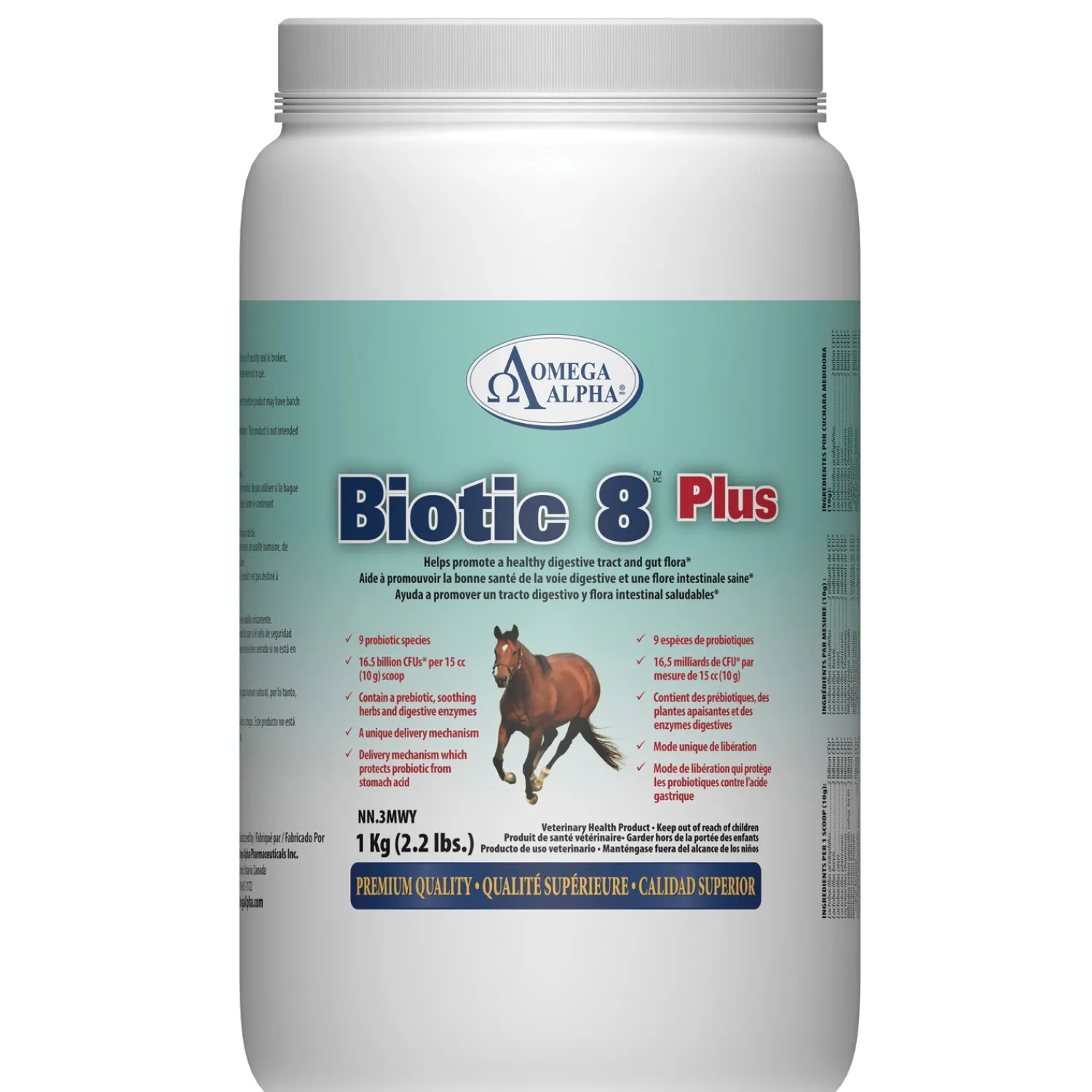 Omega Alpha® Biotic 8™ helps promote a healthy digestive tract and gut flora. This digestive supplement for horses is an eight-strain probiotic with three digestive enzymes. A carrier system helps protect the bacteria from stomach acid, allowing it to reach the gut and hind gut where it can start to populate. Biotic 8 contains spirulina and kelp as additional micro-nutrients. 2.2 pounds.