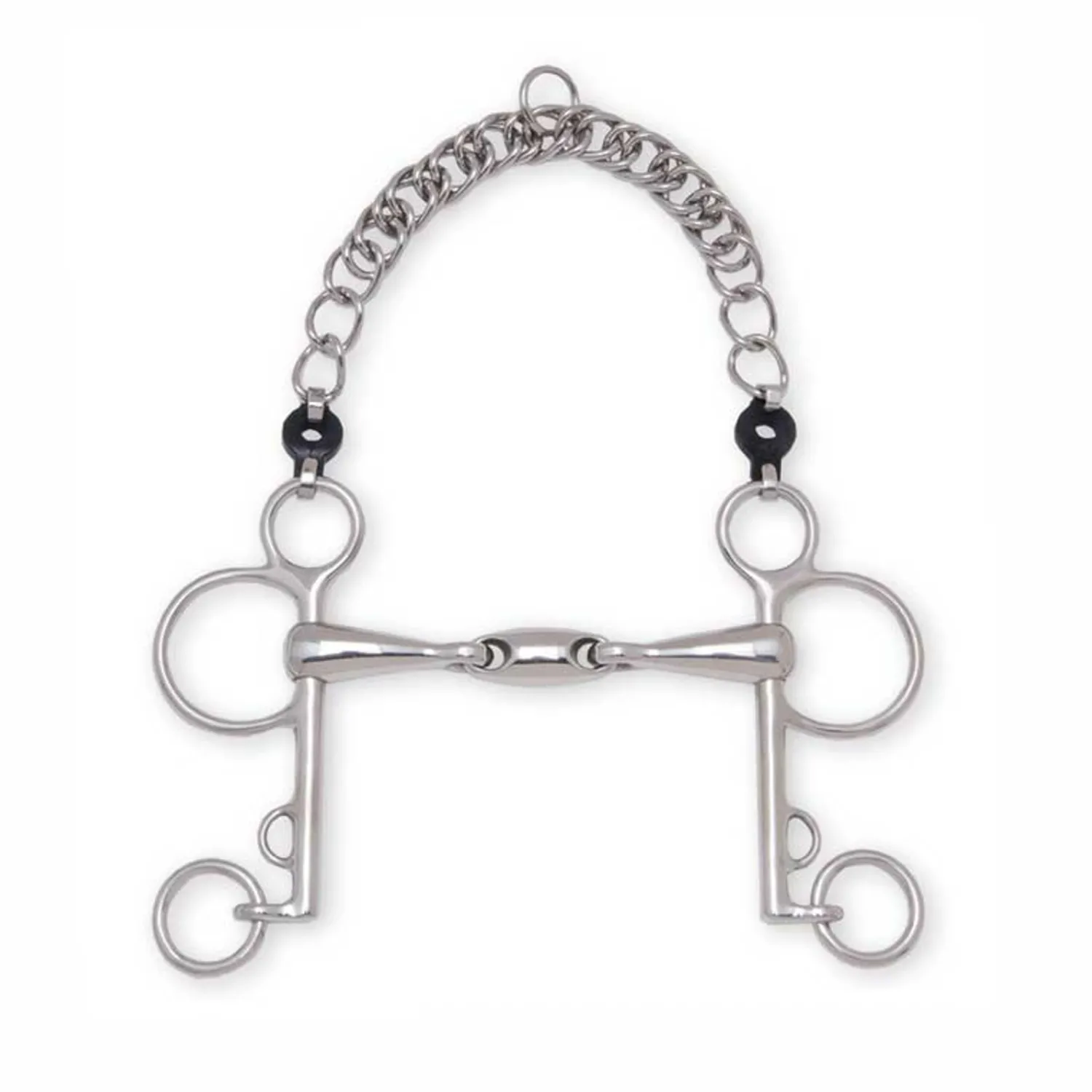 The Metalab Double-Jointed with Oval Link Pelham is a Level 3 bit in stainless steel. It features a double-jointed, oval link mouthpiece with 20mm diameter. Cheeks are 5 1/4″; 1 3/4″ bottom cheek piece.