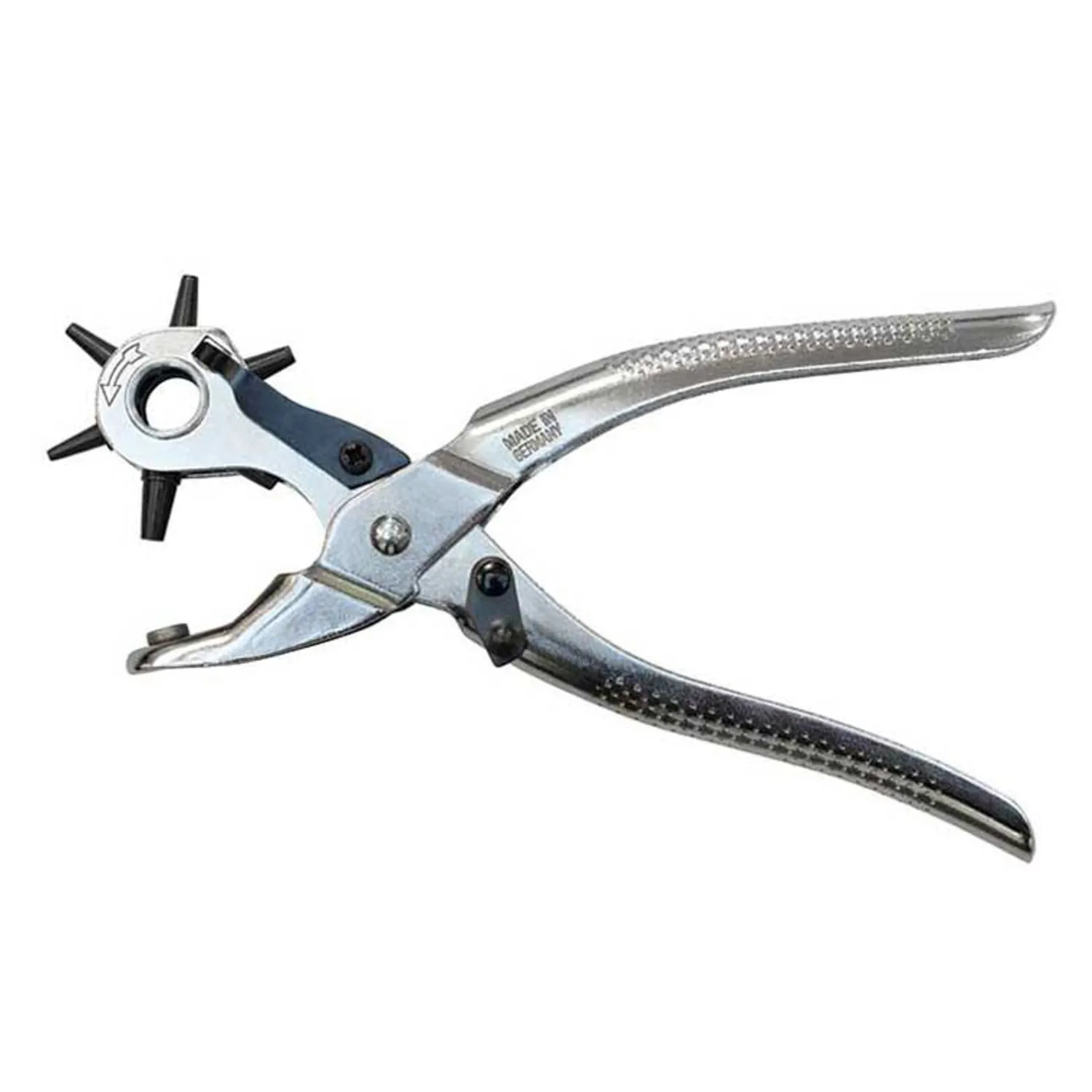 Punch adjustment holes in leather strap goods with this Revolving German Leather Punch. The six-tube revolving head allows you to punch six sizes of holes. Nickel-plated raw steel.