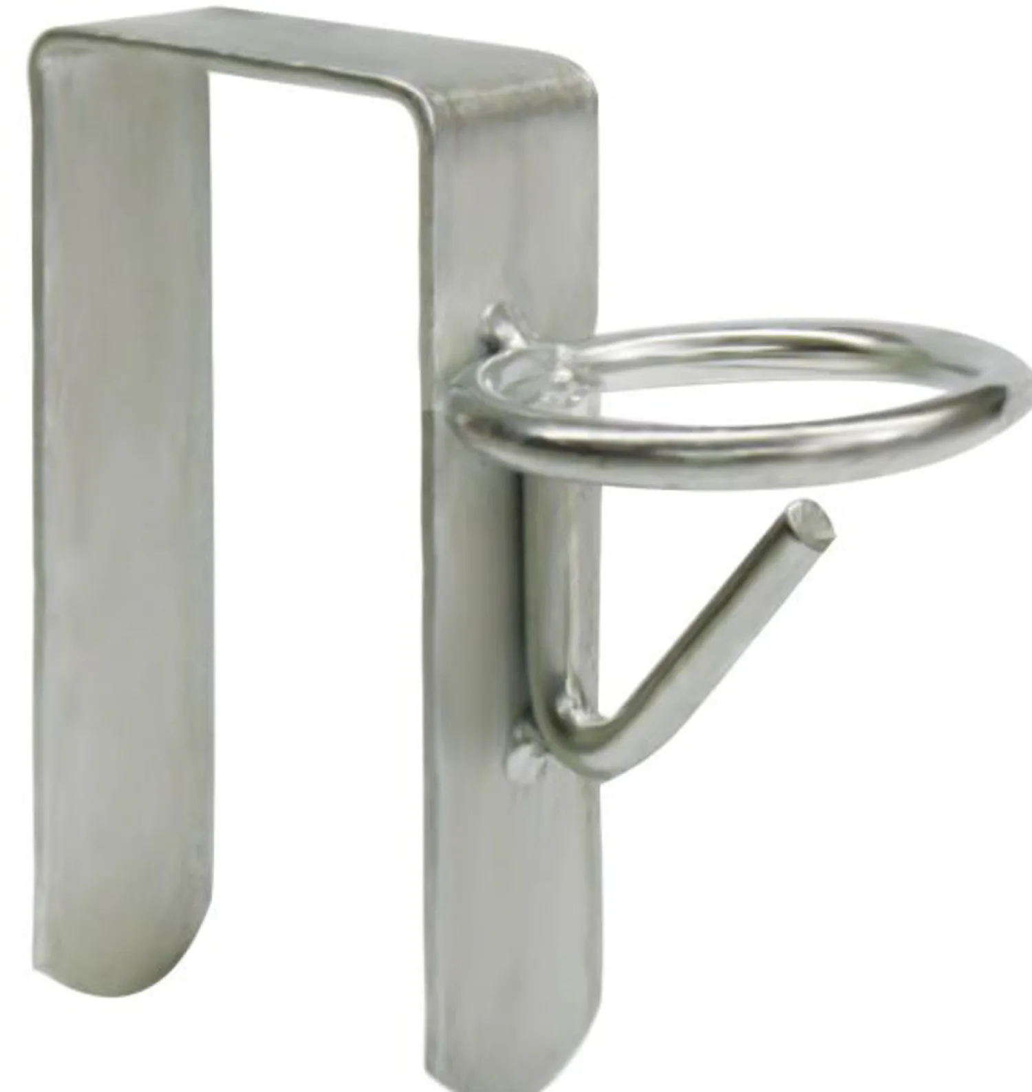 Heavy Bucket Hanger in sturdy metal can be used as a permanent or portable asset. 2 1/2″ diameter ring, 1″ plate, 2″ wide.