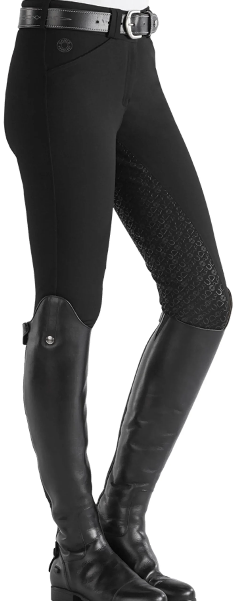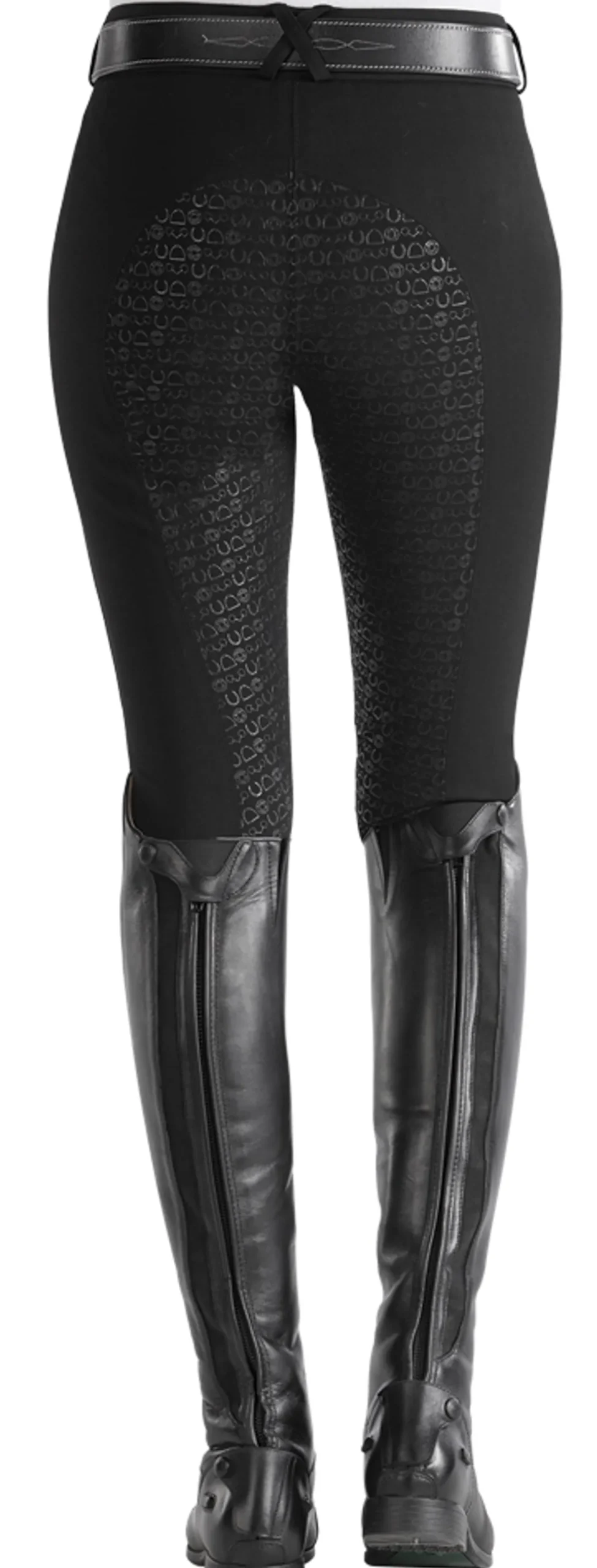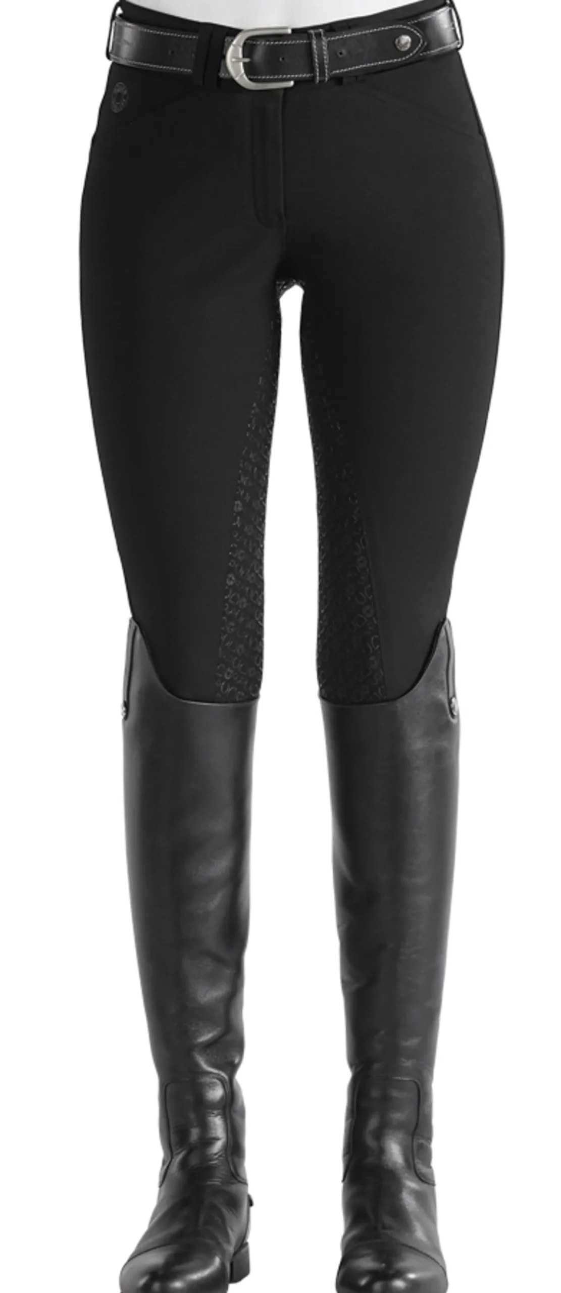 Wraparound sock bottoms are replaced with single-layer, high-stretch calf panels to provide a more custom fit and to eliminate bulk inside boots. Slash front pockets are made with low-profile stretch material for a no-show appearance on the outside and enhanced comfort on the inside. The silicone grip full seat boasts a stylish equestrian pattern and long-lasting grip.