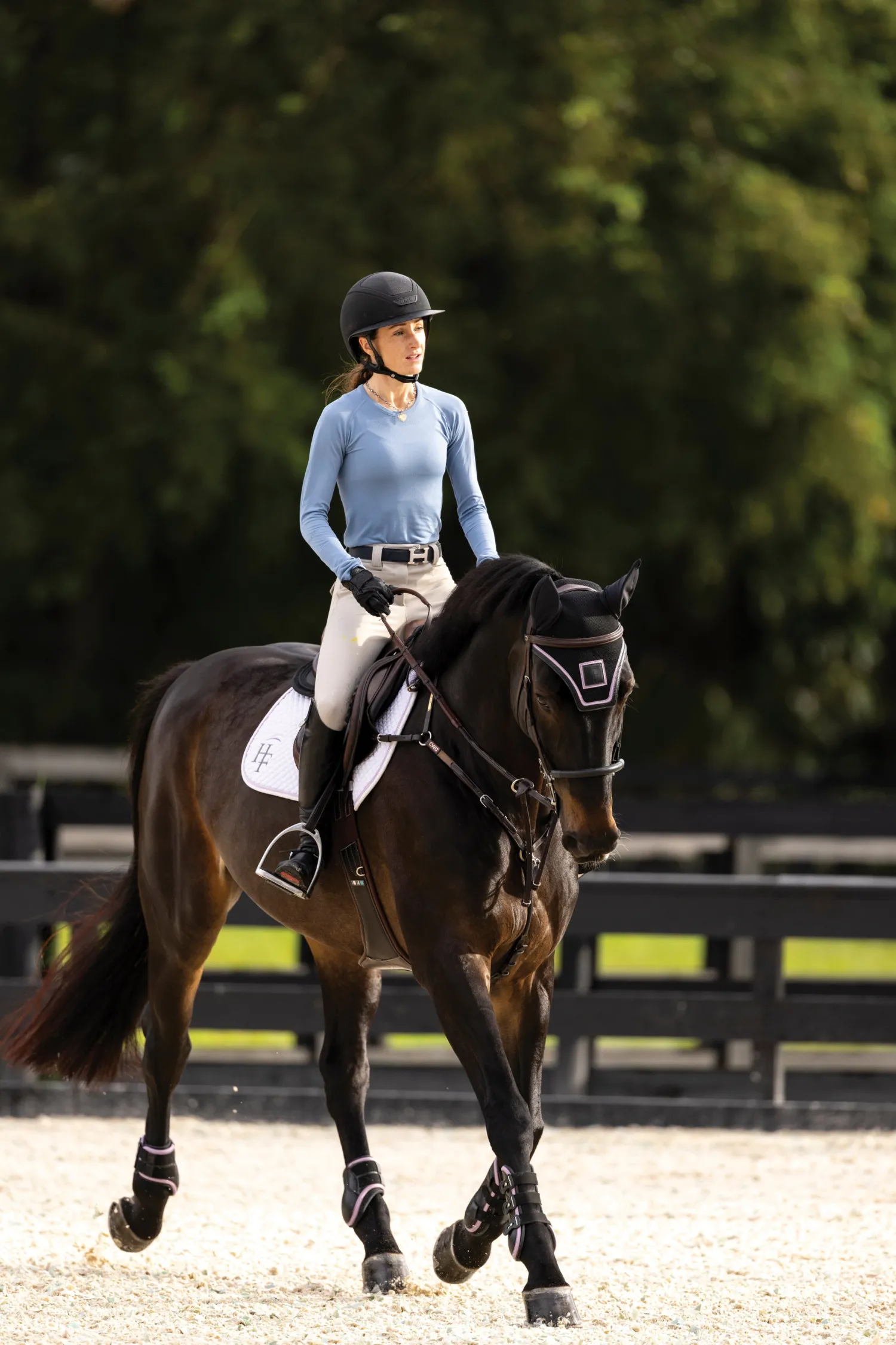 - Soft performance fabric in a denim color.