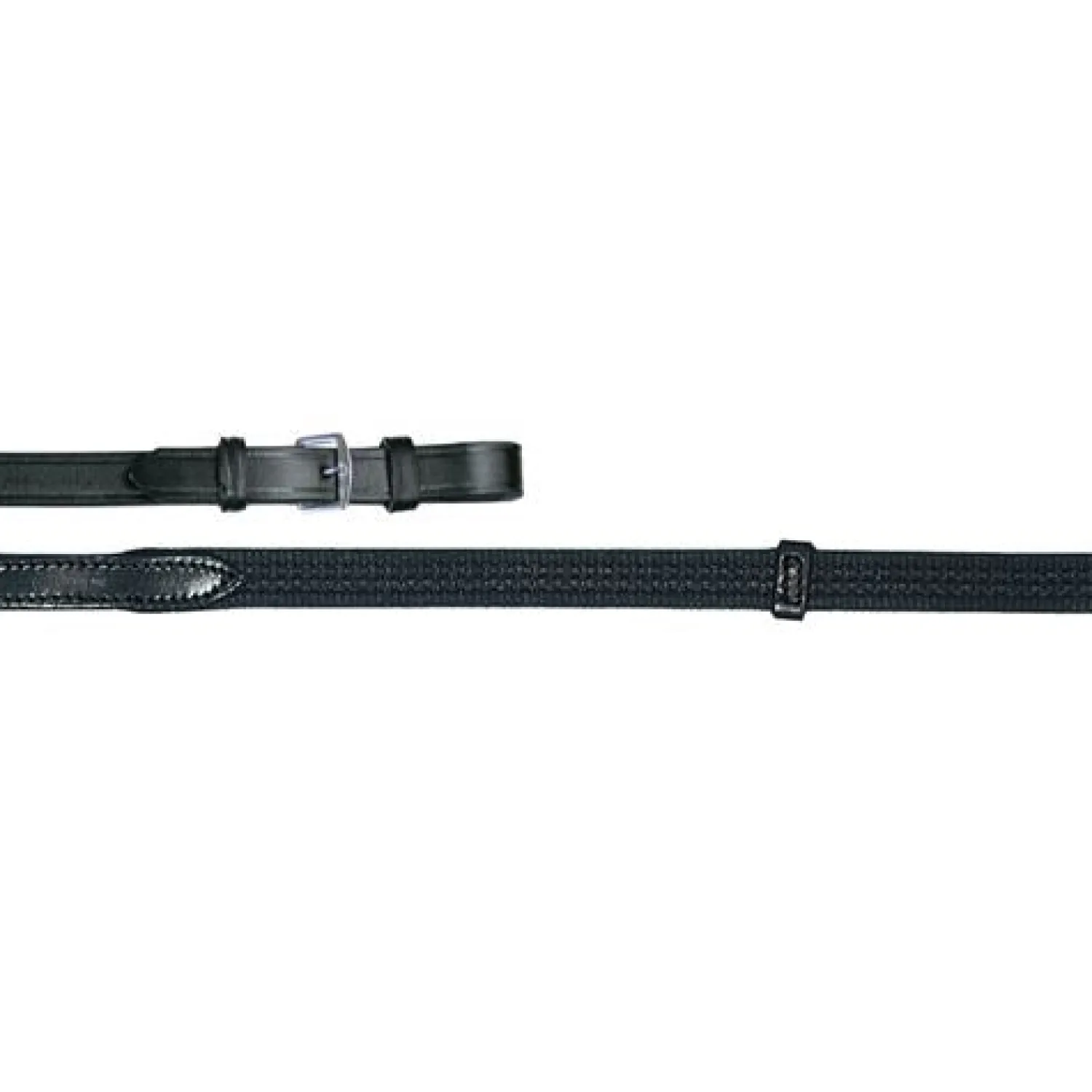Tory Leather Company Economy Web Reins are a great choice for daily riding. They combine bridle leather fronts with buckle ends and cotton webbing with leather hand stops to provide a comfortable grip. Black.