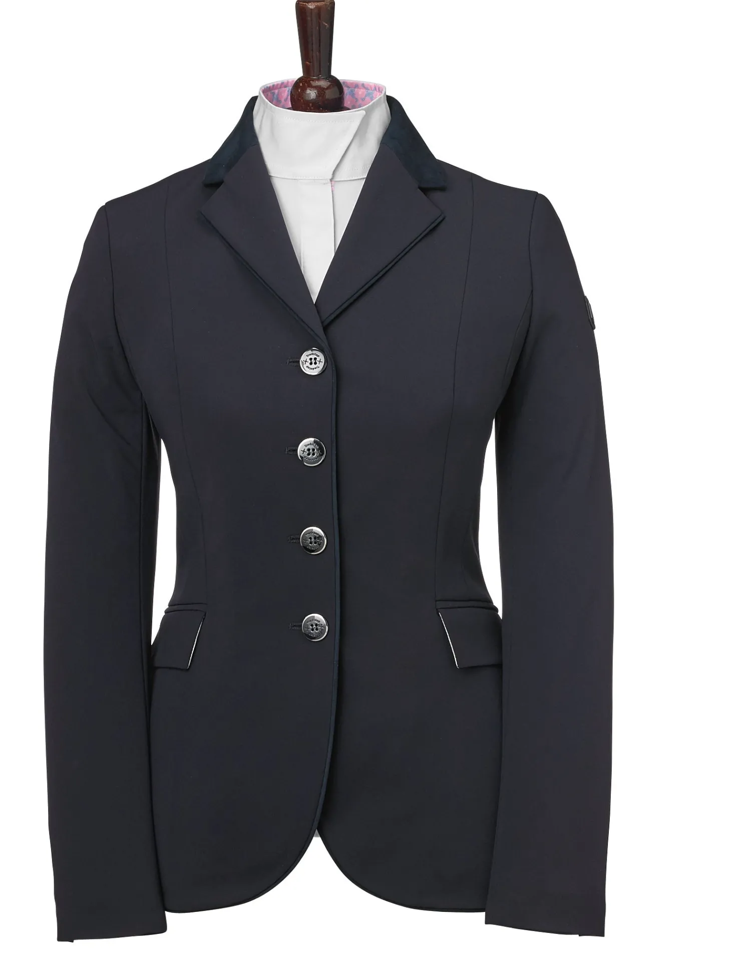 Impeccable Italian craftsmanship is reflected in every detail of the premium quality Tredstep™ Solo Showtime Show Coat. Exclusive technical fabric, developed in Italy, provides superior performance invisibly, with none of the traits that can compromise fine tailoring or a polished show ring appearance. The easy-care fabric has a dense finish for a soft hand and “noiseless” smooth movement. It provides exceptional stretch and recovery to let you enjoy 360° of flexibility, and provides water repellency, dust and stain protection, high abrasion tolerance and an anti-pill finish. Paired with a moisture-wicking, lightweight mesh lining, this highly breathable show jacket helps keep you cool. Painstaking design elements, such as figure-sculpting seams and articulated sleeves, create a gracefully refined silhouette. Subtle details let it transition to all rings and include tonal suede collars, center front piping and contrast trims on vents and pockets.