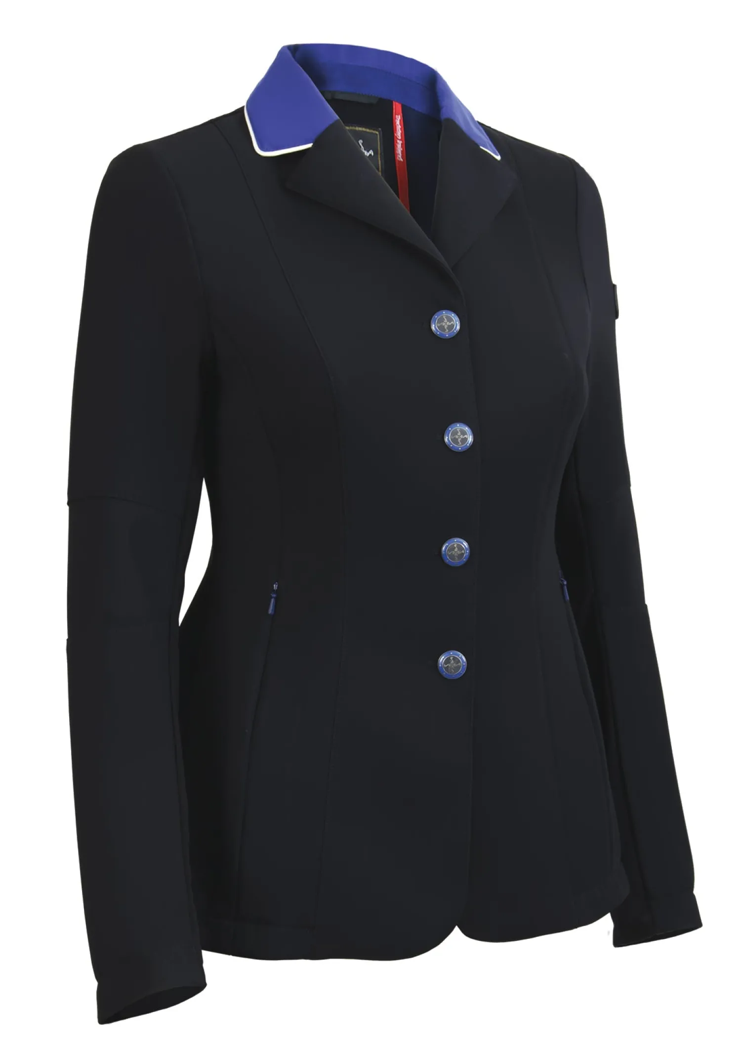 The Tredstep™ Solo Vision Coat is tailored in exclusive high performance I-Cool fabric. It’s lightweight, with silent motion and 360 degree stretch. This easy-care show jacket is at the top of its class, incorporating mesh under the articulated sleeves, a hidden front zipper under contrast snap buttons and matching contrast collars and cuff details. These elements combine grace and beauty with athletic functionally for the ultimate comfort. Left unlined to maintain the light feel. Extended sizes available.