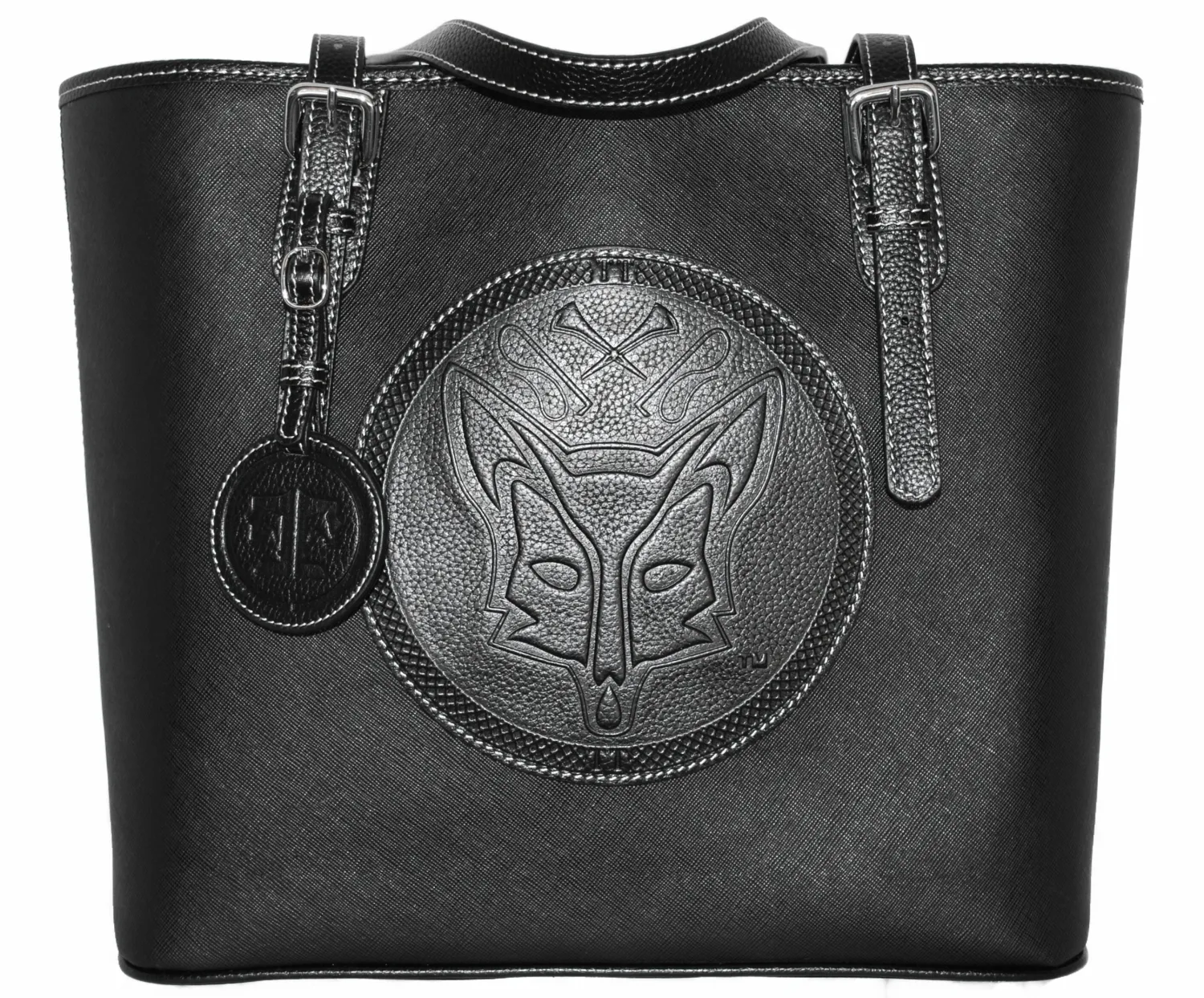 The James River Carry All is the most versatile and durable creation yet from Tucker Tweed Equestrian™. This generous tote with scratch-resistant saffiano leather exterior stands firm on carrying daily essentials to the barn, shows or for days at the office. The roomy woven scarlet-lined interior has pockets for smartphone and key fob, a large zippered pocket for extra security and a tablet compartment with snap closure and embossed leather logo. Complete with silvertone hardware and feet, this handbag is embossed with a hunter/jumper motif in pebble-grain leather of a contrasting color. Features include a silvertone lobster-clasp closure, oil rubbed edges, silver buckle accents and double handles with adjustable 7-11″ drop. Includes cream satin logo dust cover.